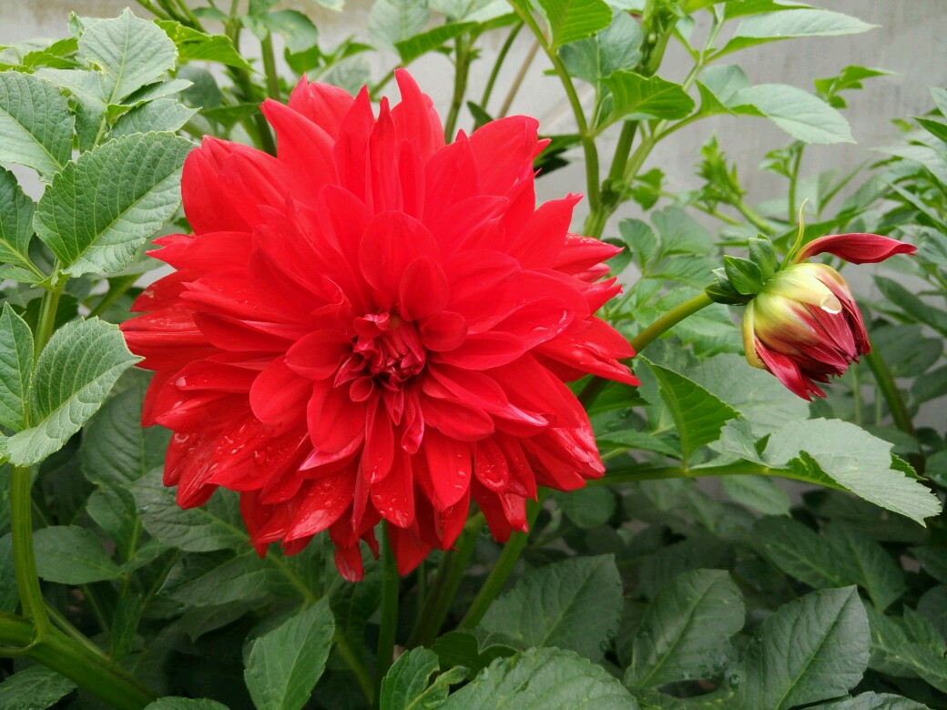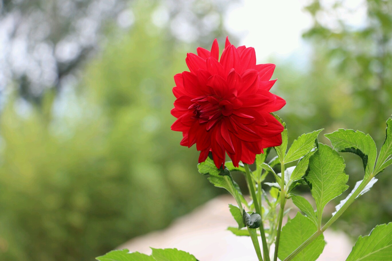 大丽花茎直立,多分枝,高1.5-2米,粗壮。叶1-3回羽状全裂,上部叶有时不分裂,裂片卵形或长圆状卵形,下面灰绿色,两面无毛。