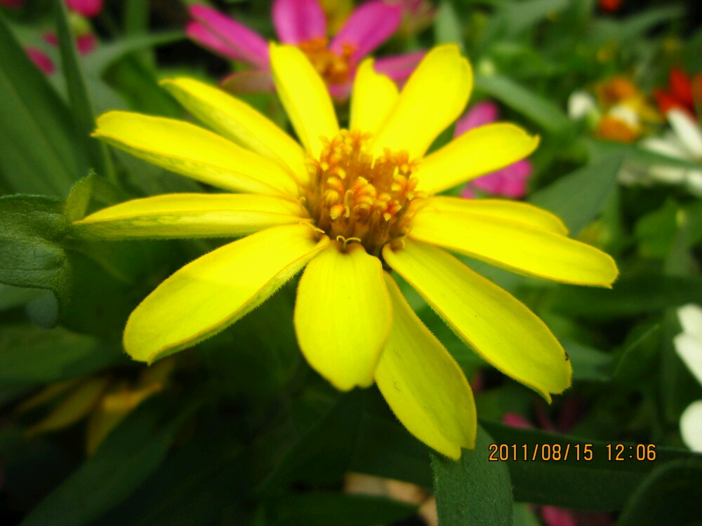 小百日菊是一年生草本,株高15~60厘米,全株具毛。叶对生全缘,卵形或长椭圆形,基部抱茎。花色有黄色,粉色及复色等。单瓣,先端有缺刻。花期6~9月。