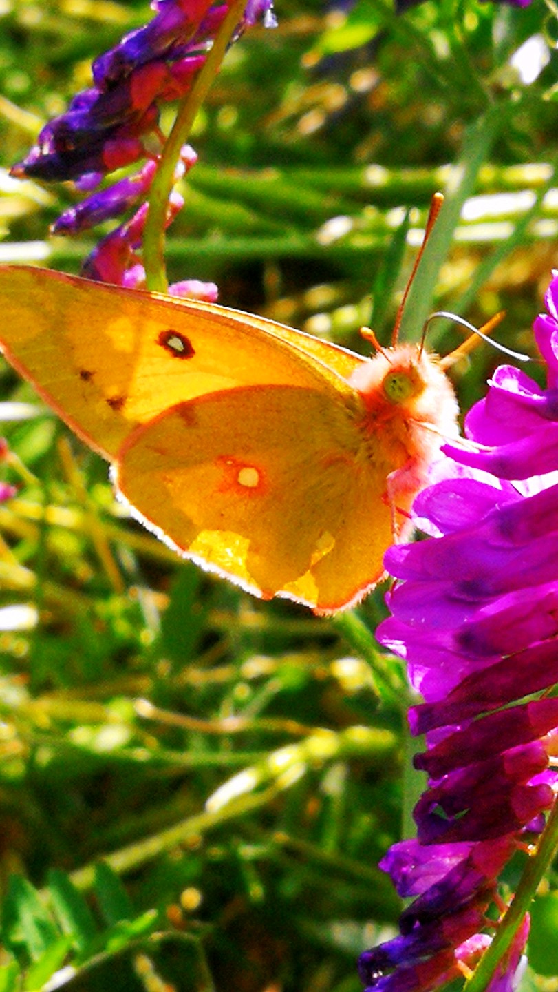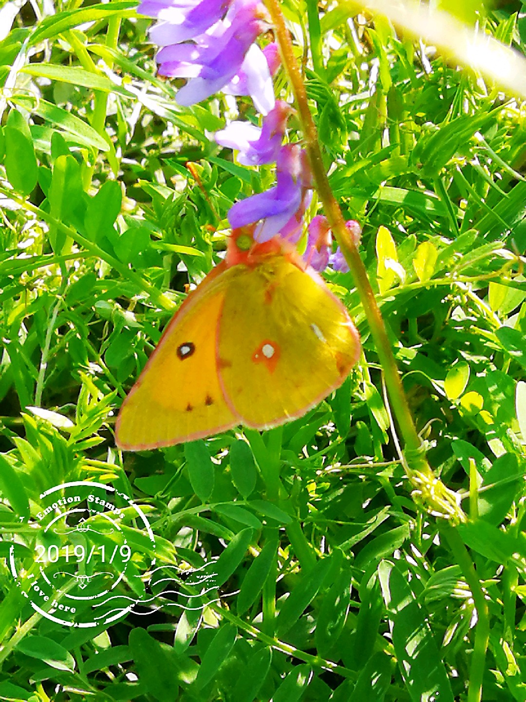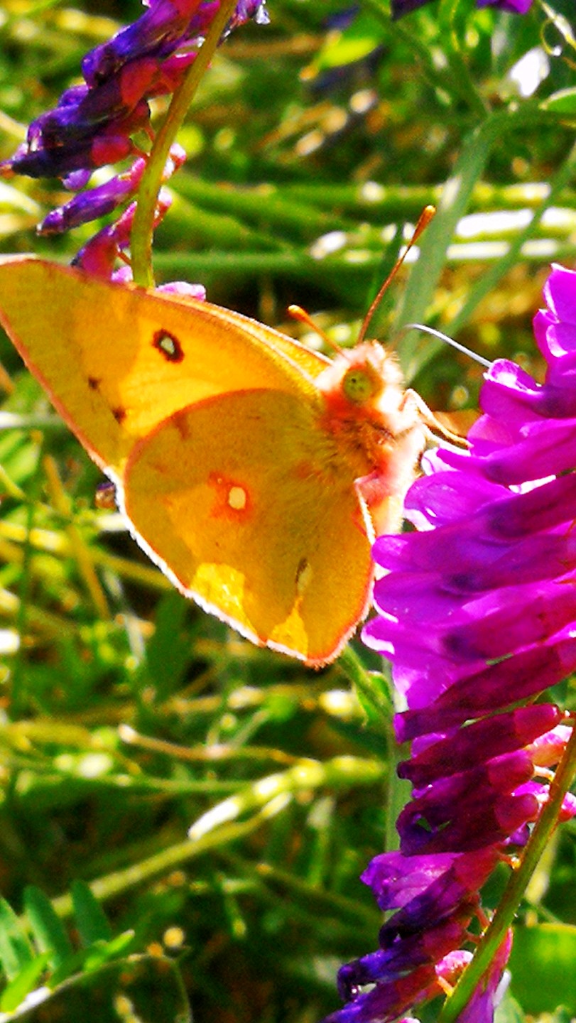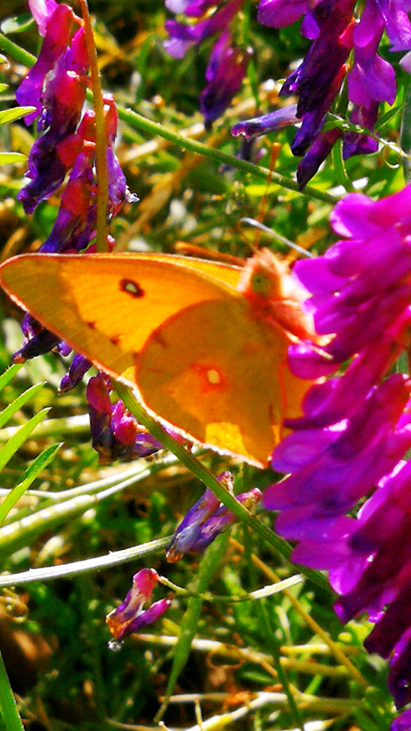山坡上广布野碗豆花上黄纹粉蝶