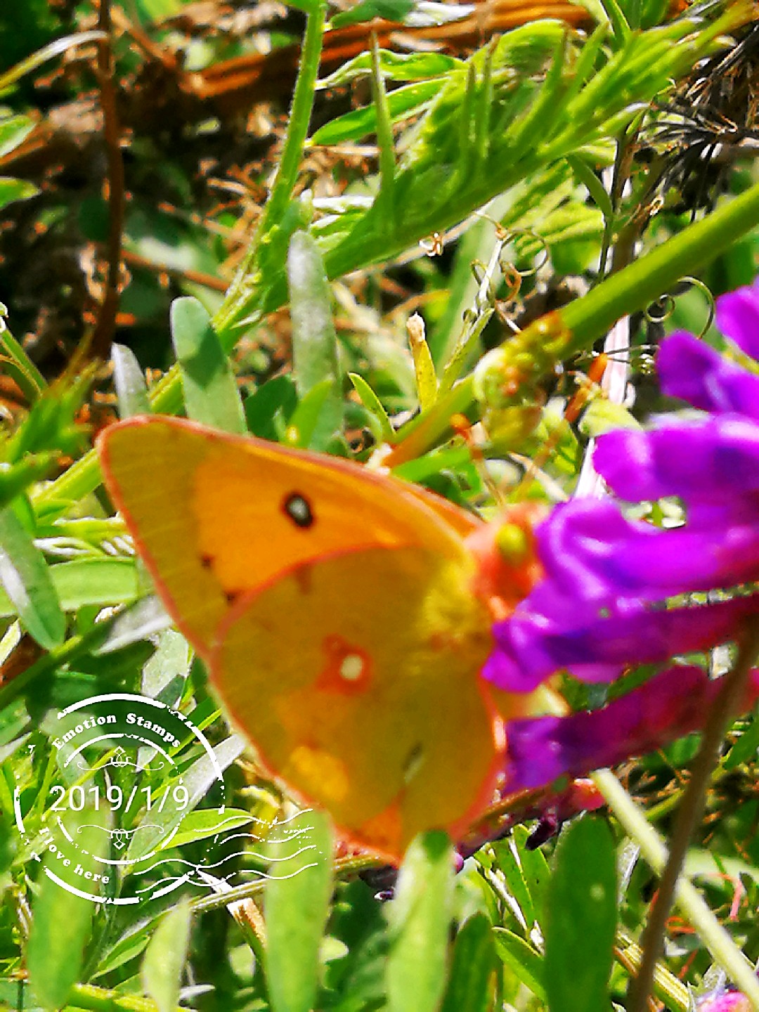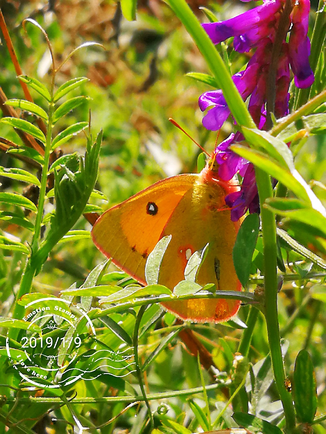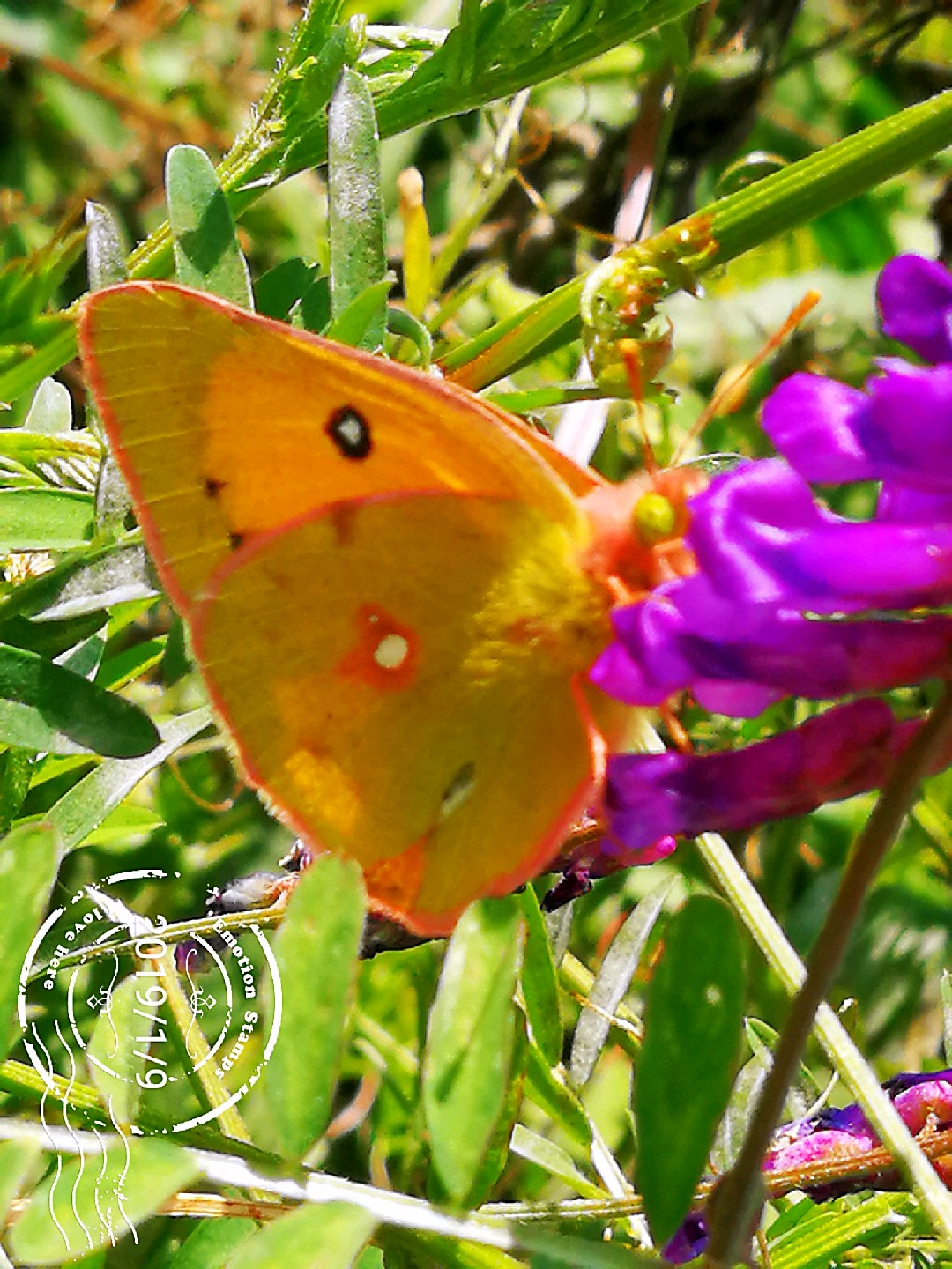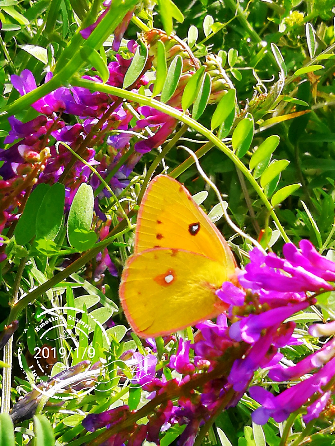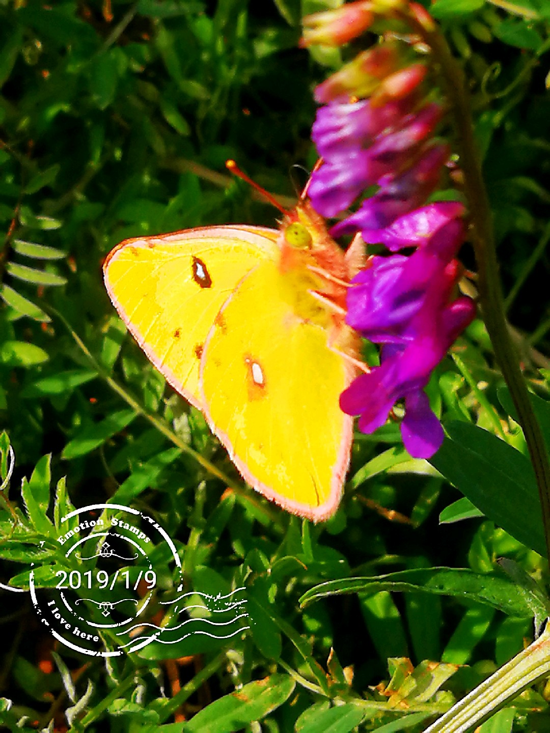 山坡上广布野碗豆花上黄纹粉蝶