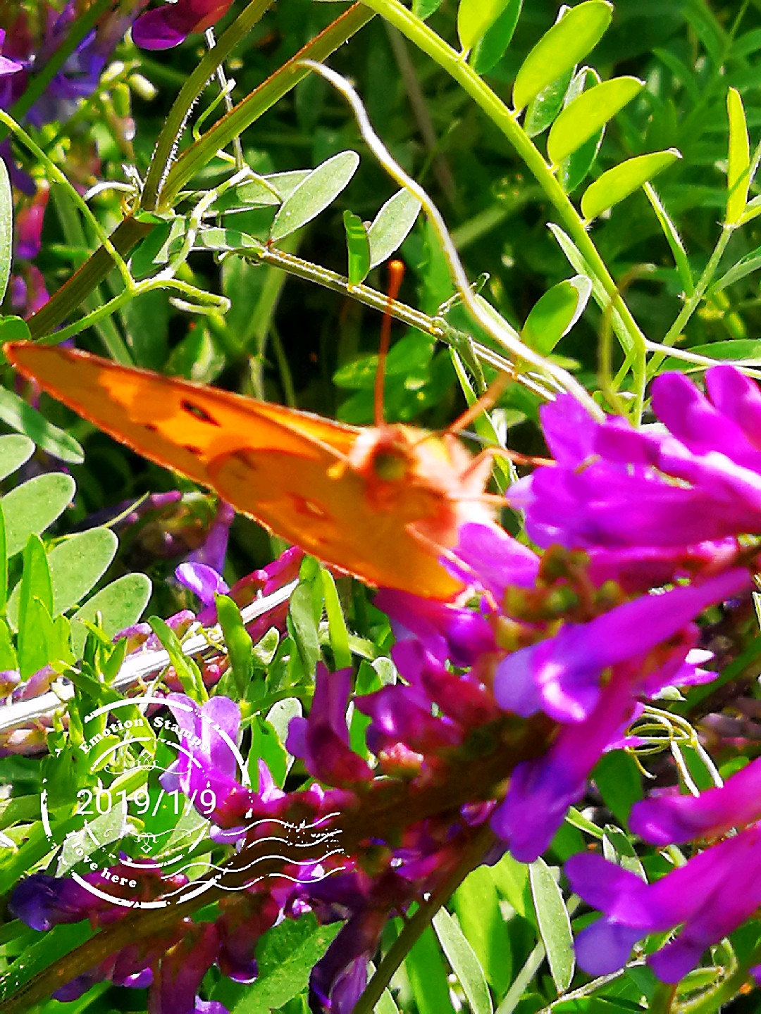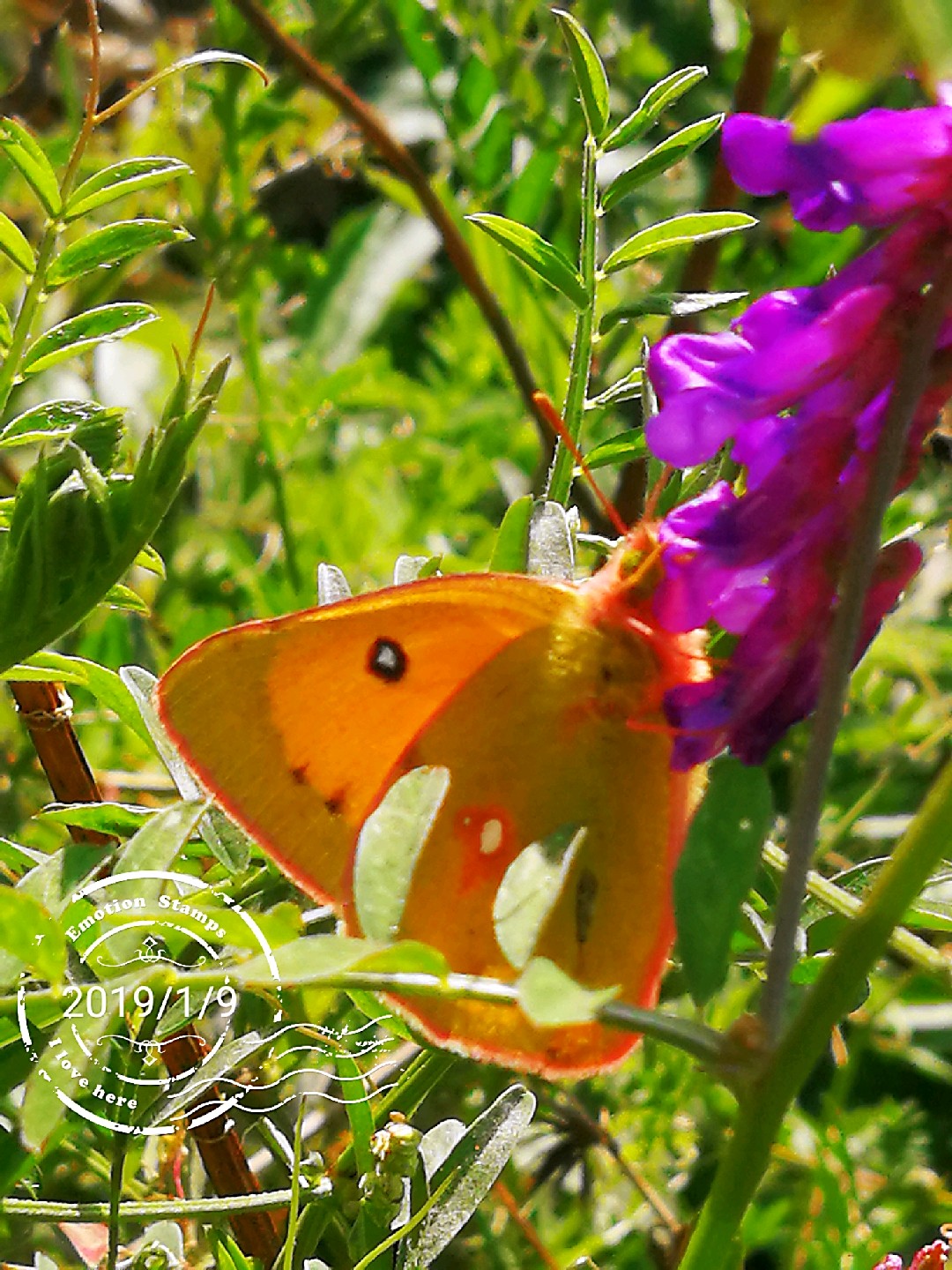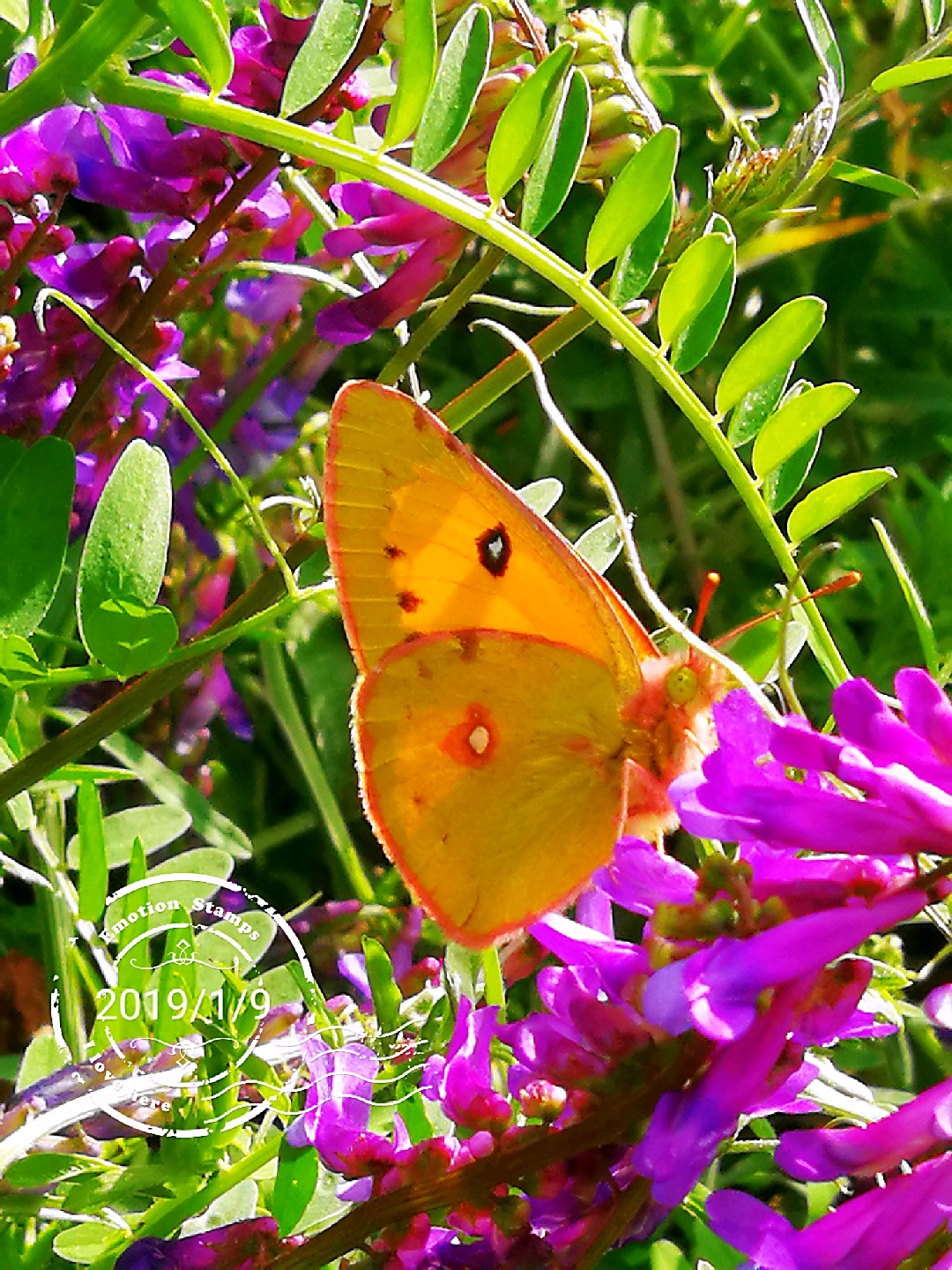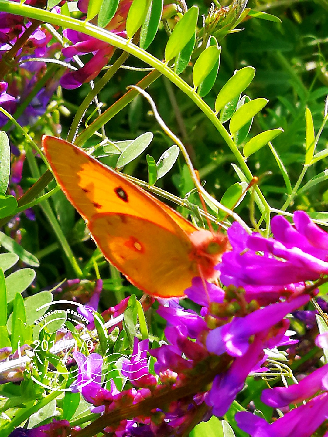 山坡上广布野碗豆花上黄纹粉蝶
