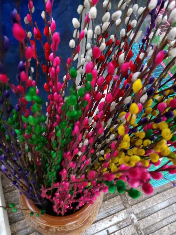 735. 五颜六色的银柳,颜色是染的,但水插能开花。