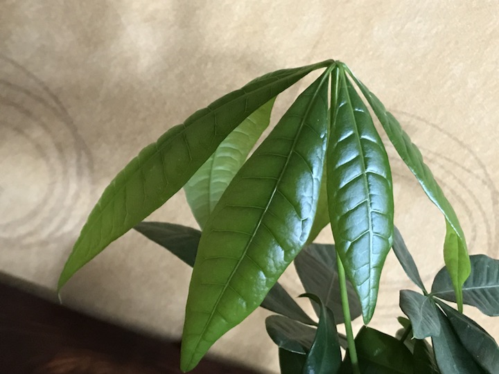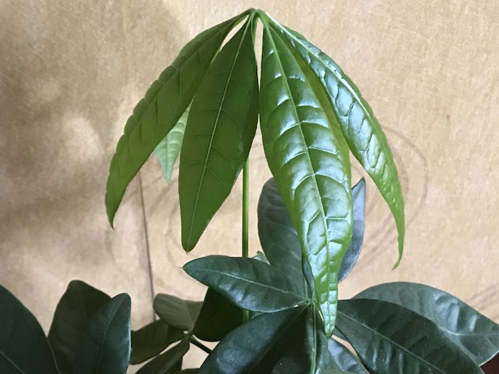 它刚抽芽的时候便发现了它的独特之处,别的叶子都是平铺的生长,只有它是蜷缩的状态,长了好长一段时间才慢慢的把小伞撑开,6枚小叶更是显得与众不同。