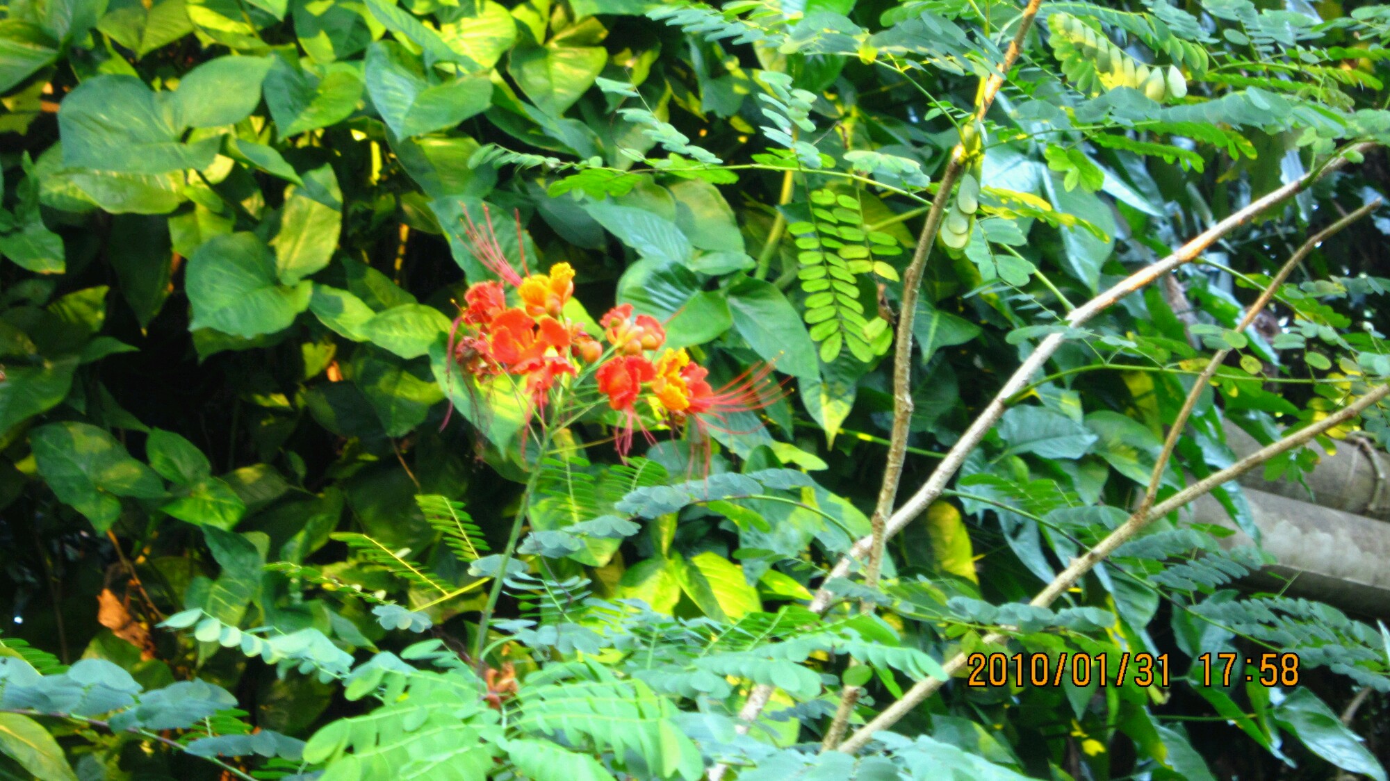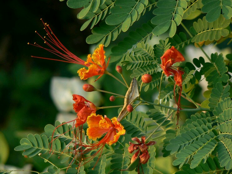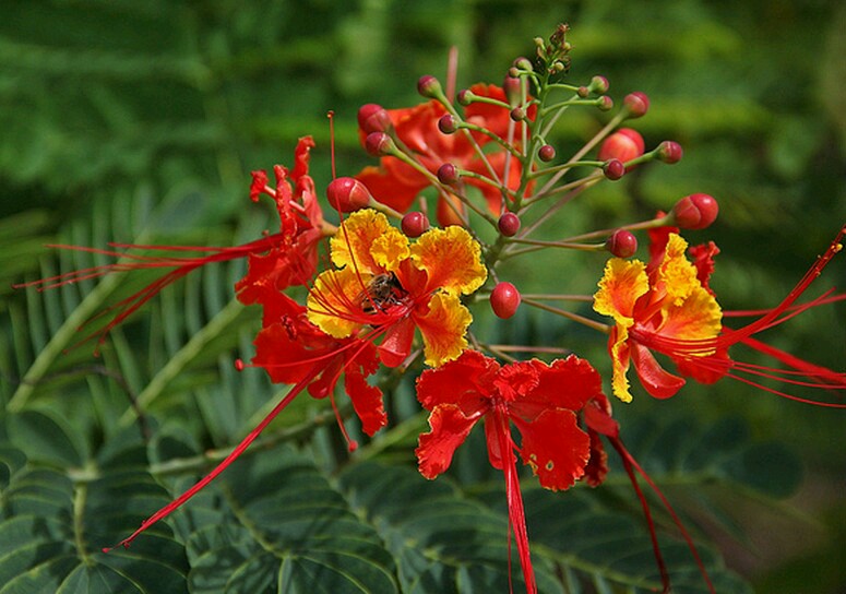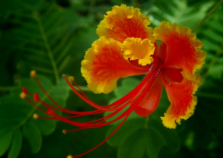 金凤花,原产于西印度群岛,豆科云实属直立常绿灌木。高达3米,花冠橙红色,边缘金黄色,如火焰蝴蝶般常年于枝头盛开,为热带地区有价值的观赏树木之一。