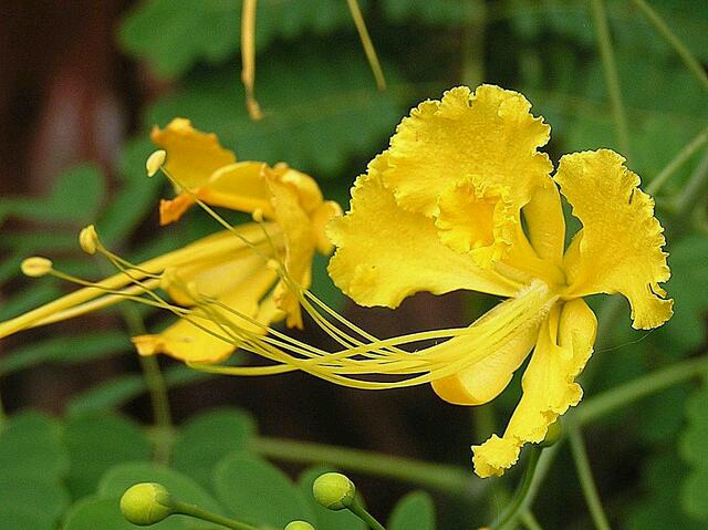 金凤花的花形格外奇巧,花朵宛如飞凤,那花有头有尾有翅有足,生动形象,活灵活现,就像一只凤凰在飞翔,令人不得不赞叹大自然造化的神奇绝妙。