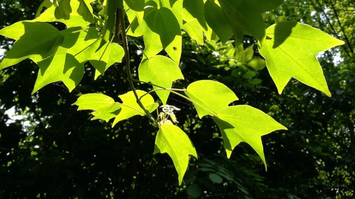 叶纸质,基部近于圆形或楔形,外貌椭圆形或倒卵形,长6-10厘米,通常浅3裂,裂片向前延伸,稀全缘,中央裂片三角卵形,急尖、锐尖或短渐尖;侧裂片短钝尖或甚小,以至于不发育,裂片边缘通常全缘,稀具少数锯齿;裂片间的凹缺钝尖;上面深绿色,下面黄绿色或淡绿色,被白粉,略被毛,在叶脉上较密;初生脉3条,稀基部叶脉也发育良好,致成5条,在上面不显著,在下面显著;侧脉通常在两面都不显著;叶柄长2.5-5厘米,淡紫绿色,细瘦,无毛。