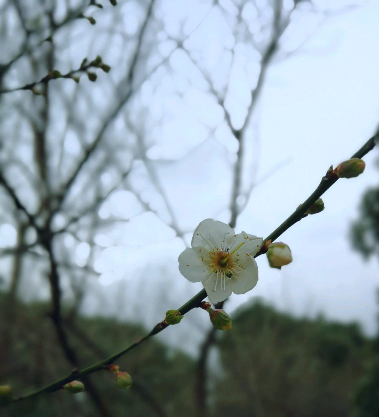 遇到这朵孤单单梅花的时候,公园里的梅树才刚刚吐蕊。寻了很久,才寻到这朵亭亭独立的她。然而,因为开得早,必然也落得快,也算是茕茕孑立吧!
