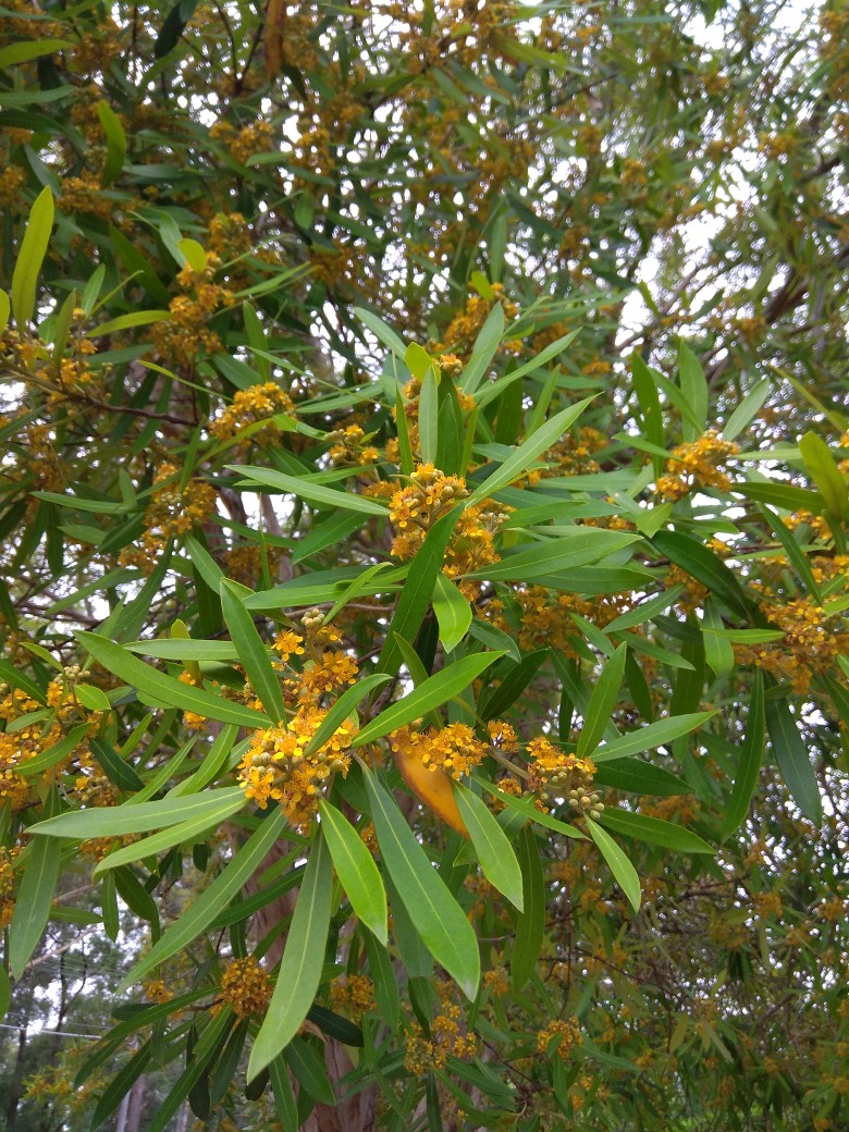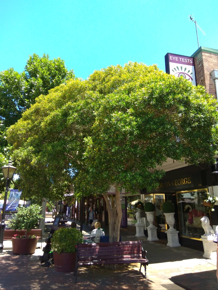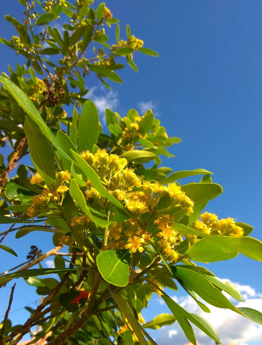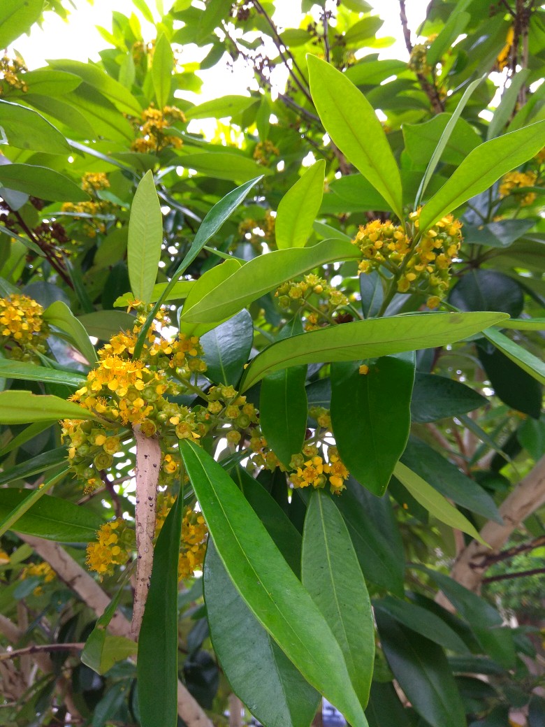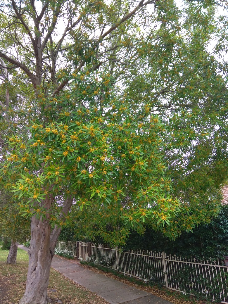 盛夏日子,阳光洒在道边树上,满树小花上会散发出金光,这就是月桂叶水桉
