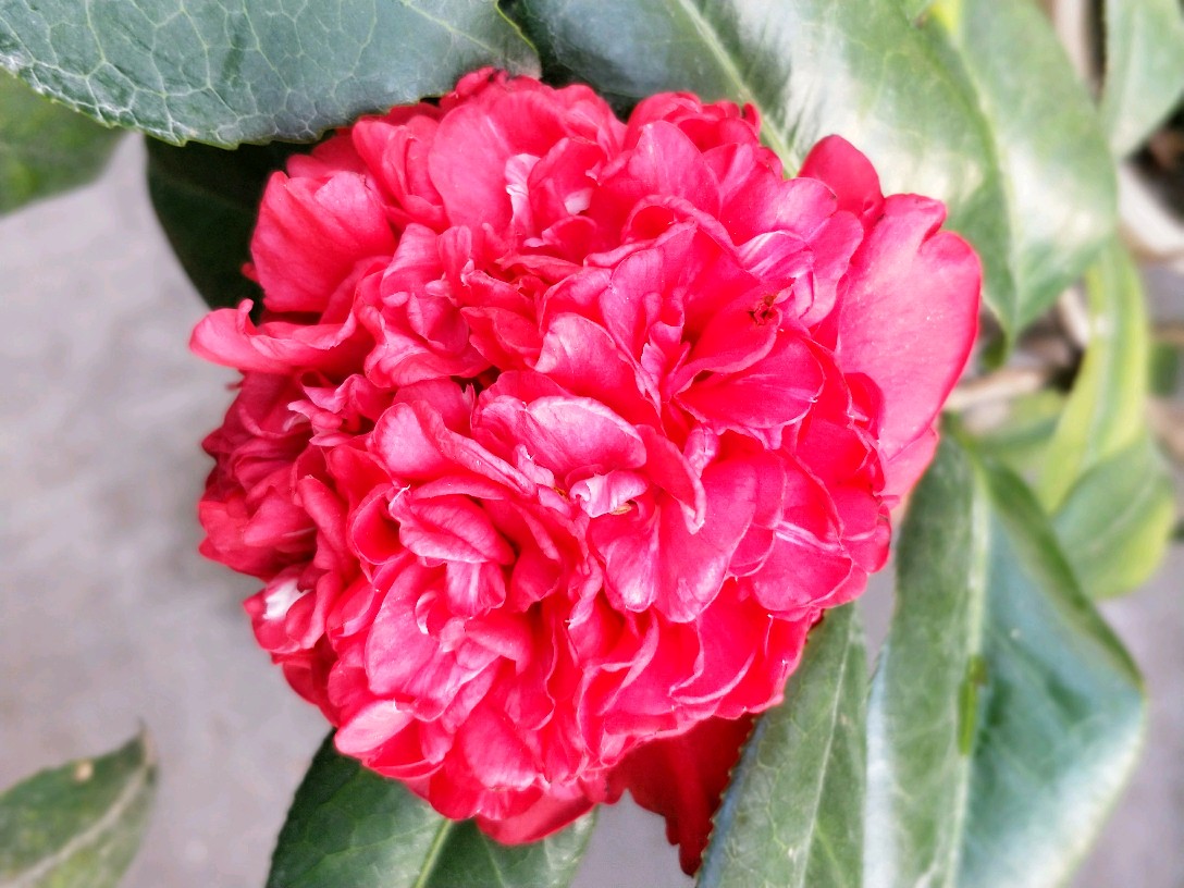 花黑红色,蜡质感,托桂型,小-中型花,中部小花瓣簇拥成团,偶有雄蕊外露,花稠密。叶子浓绿色,小椭圆形,光亮,嫩叶红色。