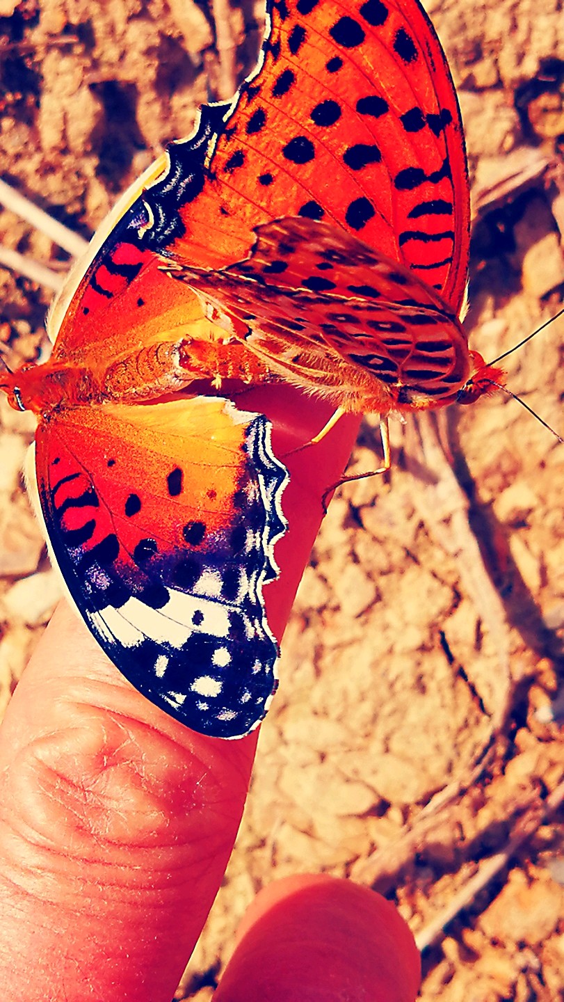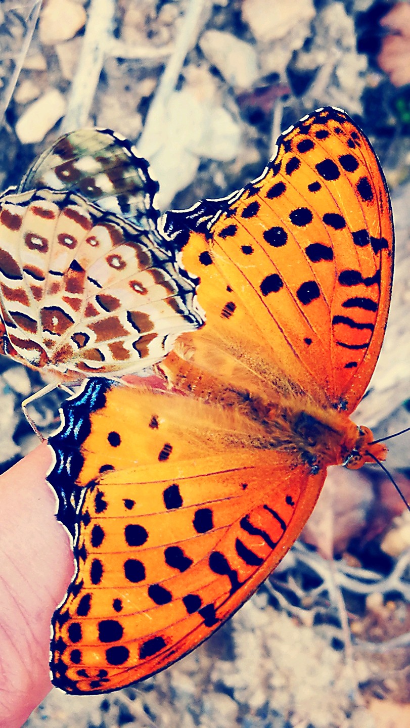 手指上摇摇欲飞的双双红老豹蛱蝶