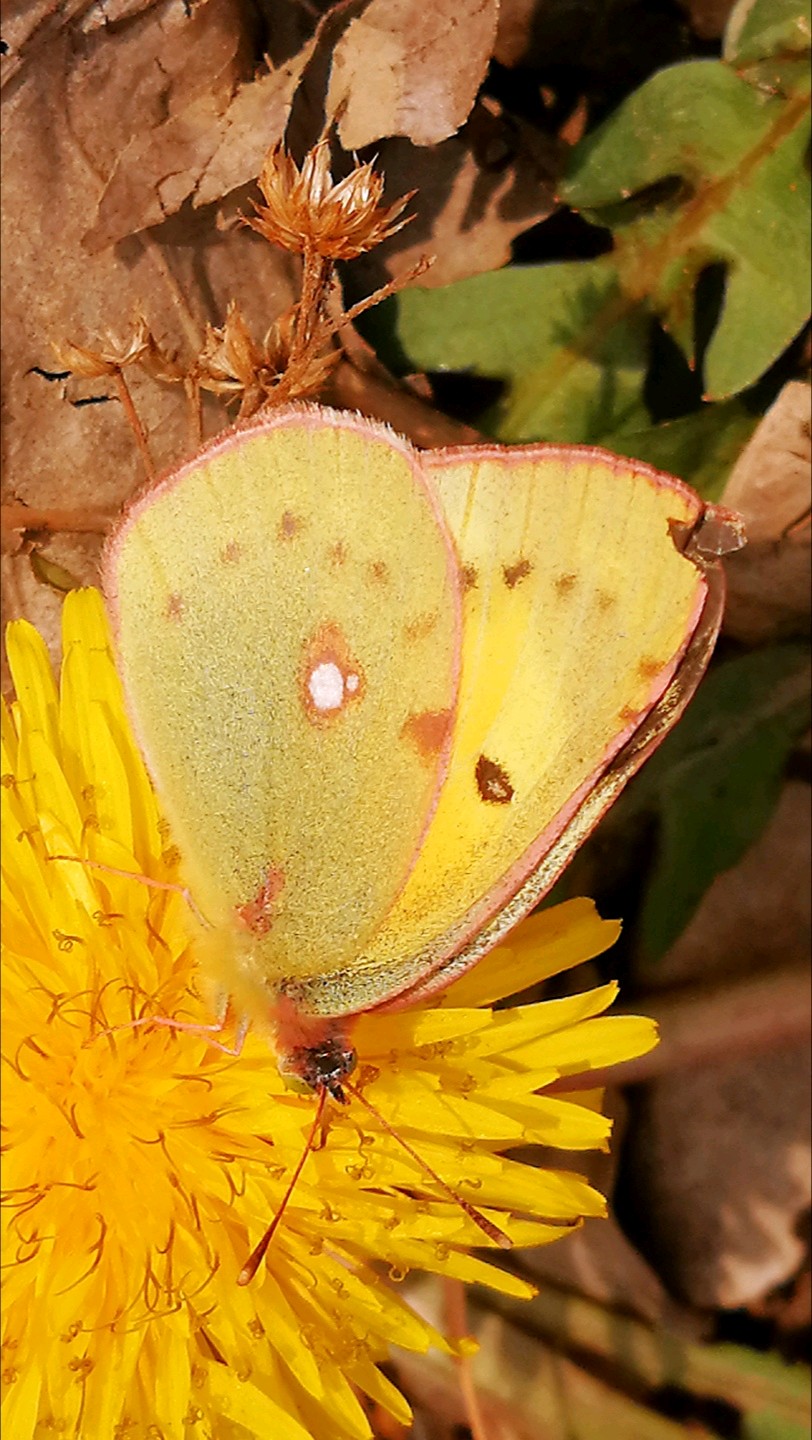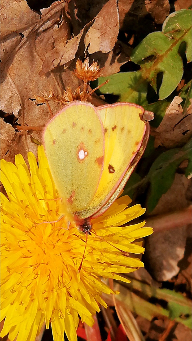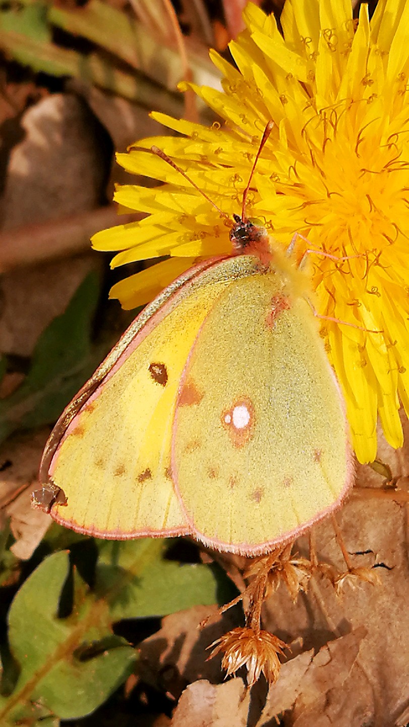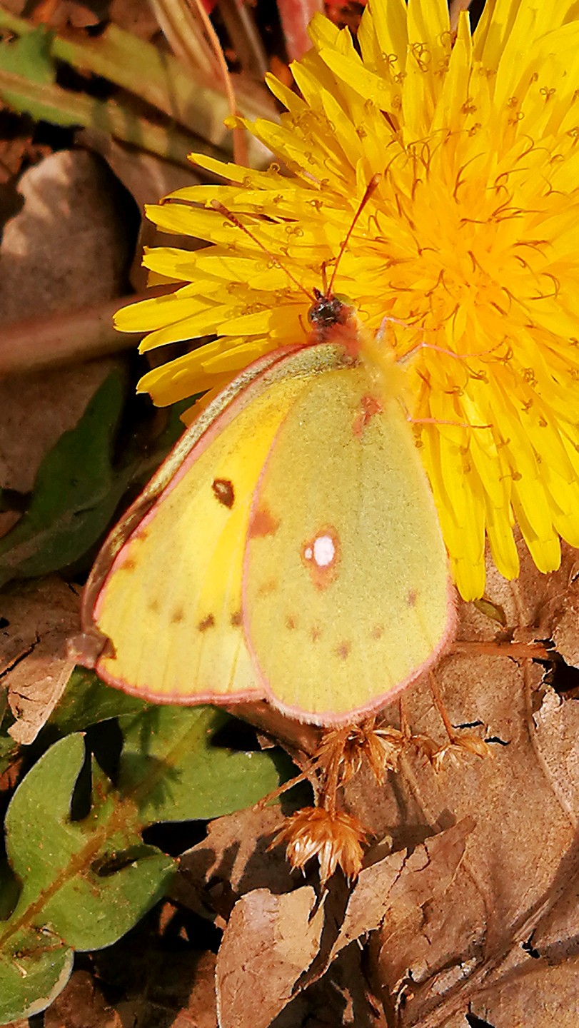 蚕豆地边蒲公英花上的橙黄豆粉蝶