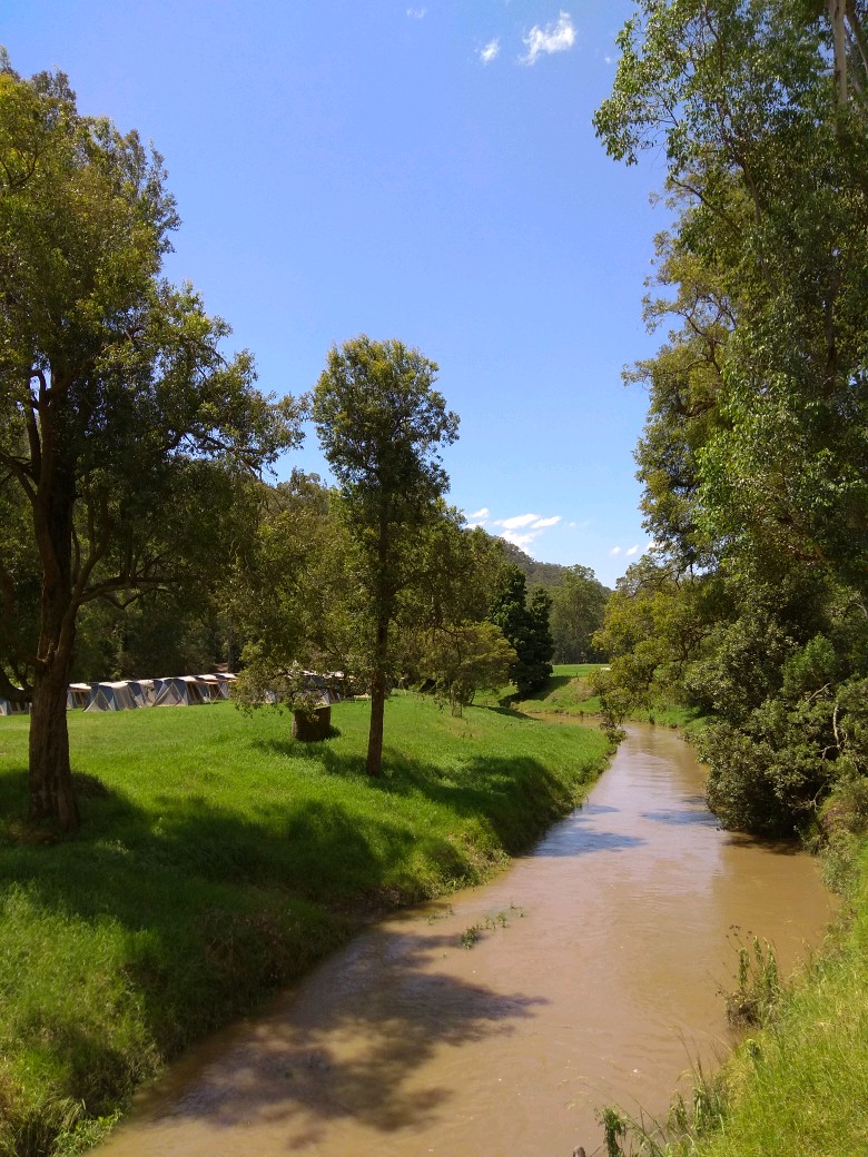 谷底小河雨后变黄浊了,平时清澈见游鱼,有一种土生小鲈鱼Bass