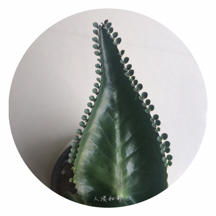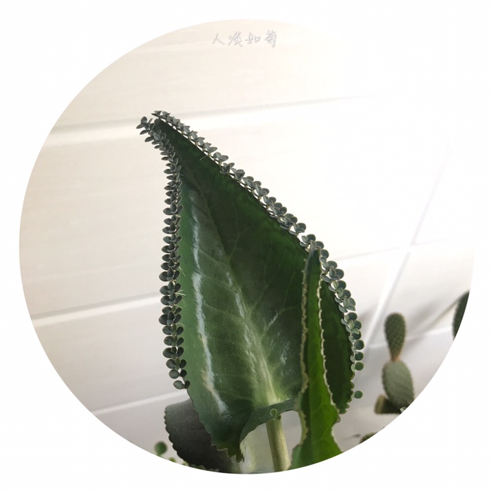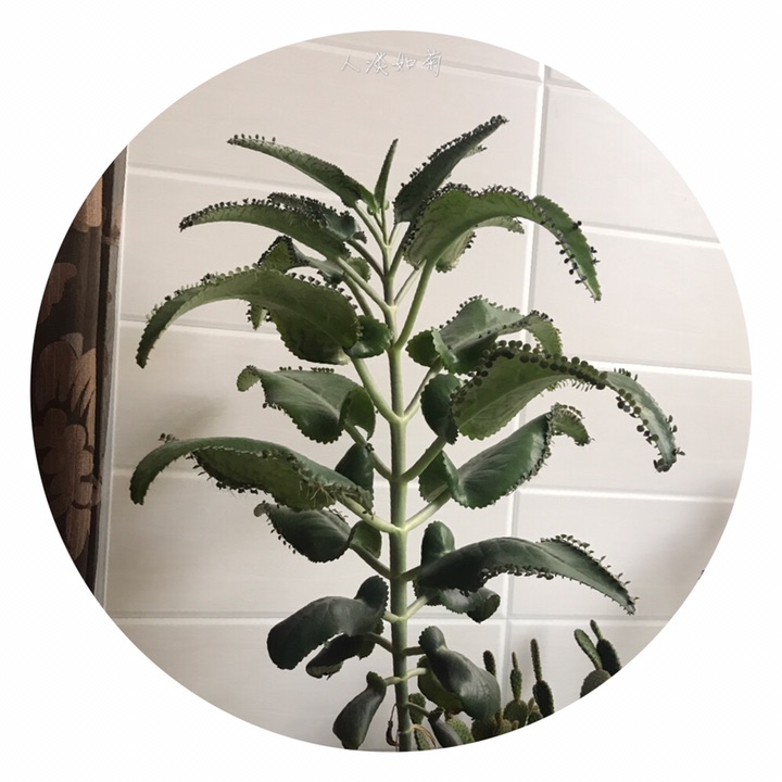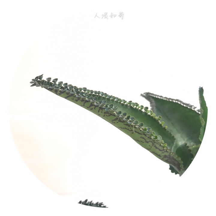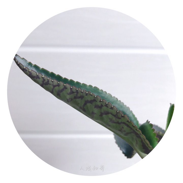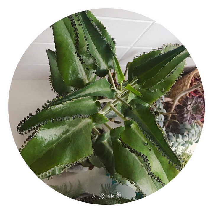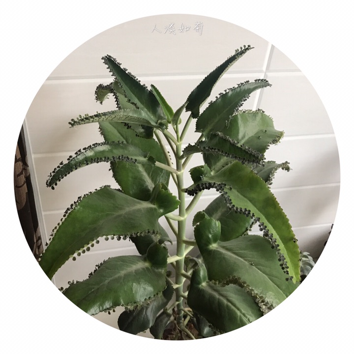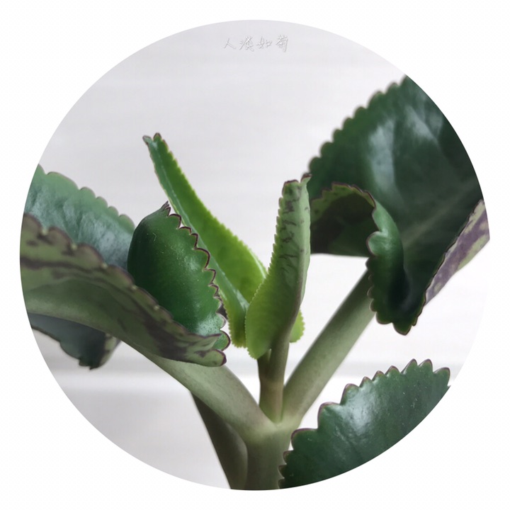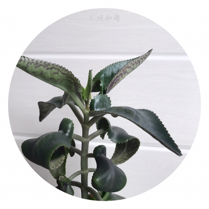 大叶虎纹落地生根 Kalanchoe daigremontianum/Bryophyllum daigremontianum 景天科伽蓝菜属多肉植物(过去归为落地生根属 Bryophyllum),也叫大叶虎纹不死鸟。大叶虎纹落地生根,茎直立生长,少分枝,可以很高,过高植株容易倾倒,大叶虎纹落地生根叶对生,叶片长三角形,有点合拢,叶缘锯齿明显,会从缺刻处长出不定芽,叶面深绿色,叶背有深紫色虎皮花纹,故名虎纹。
