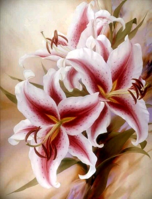 今天😊,这一幅画还是俄罗斯🇷🇺著名的画家艾格尔.利亚索他画的,他画的这一些美丽的百合花🌸,感觉在寻找着太阳慈爱的光辉,但是,它们却一直在“看着😁”😁我们大家,每一朵百合花🌸的花药💊都是一个合拢的状态。