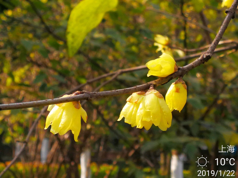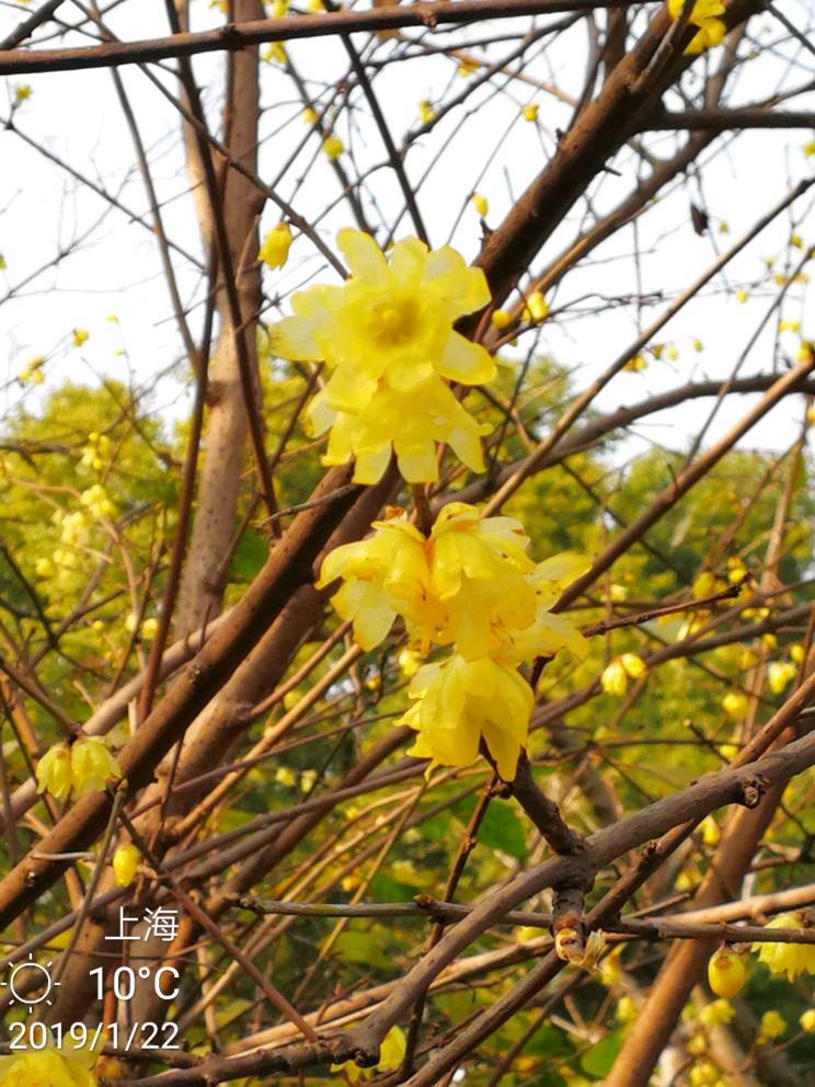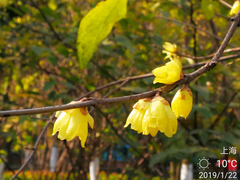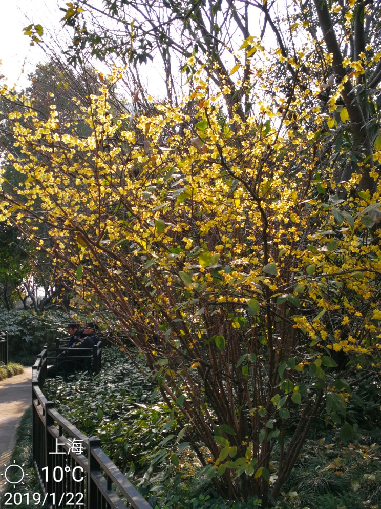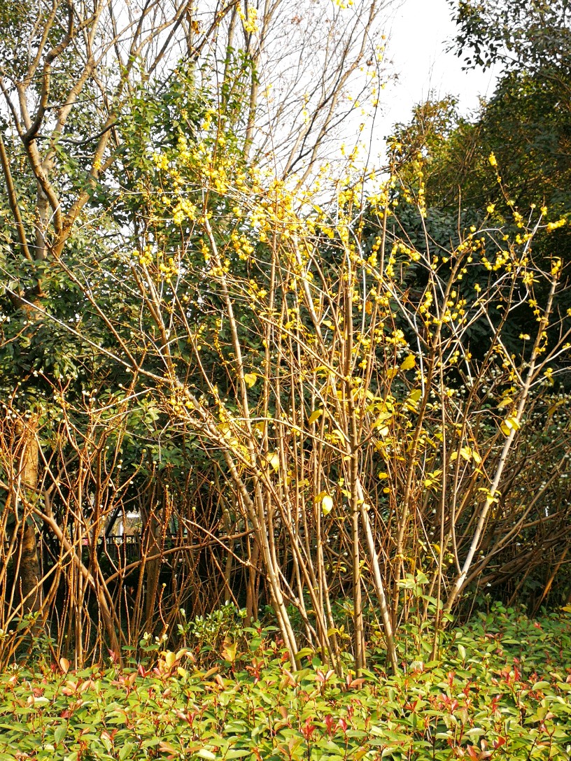 有,果然有!闻香识蜡梅。在一处被铁栏杆围起的封闭小园里,几株丛生的蜡梅正在怒放,金黄点点,煞是亮丽,然美中不足的是,天气不冷导致蜡梅的旧叶没有落完,影响赏梅的整体视觉效果。