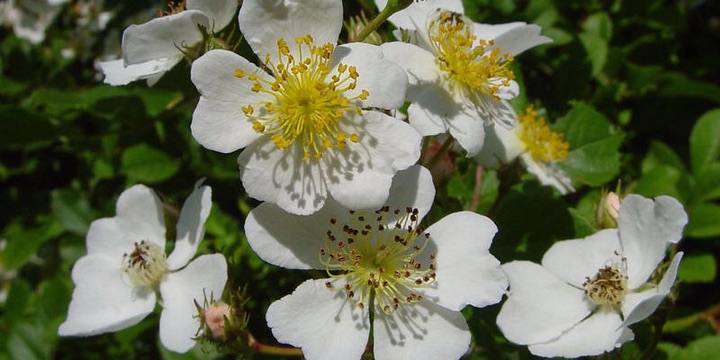 蔷薇,主要指蔓藤蔷薇的变种及园艺品种。大多是一类藤状爬篱笆的小花,花常是6-7朵族生,为圆锥状伞房花序,生于枝条顶部,花径约3厘米,每年只开一次。蔷薇花花盘环绕萼筒口部,有白色、黄色等多种颜色。花谢后萼片萼片会脱落;果实为圆球体。