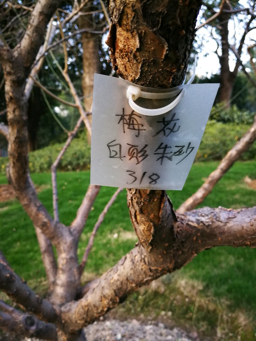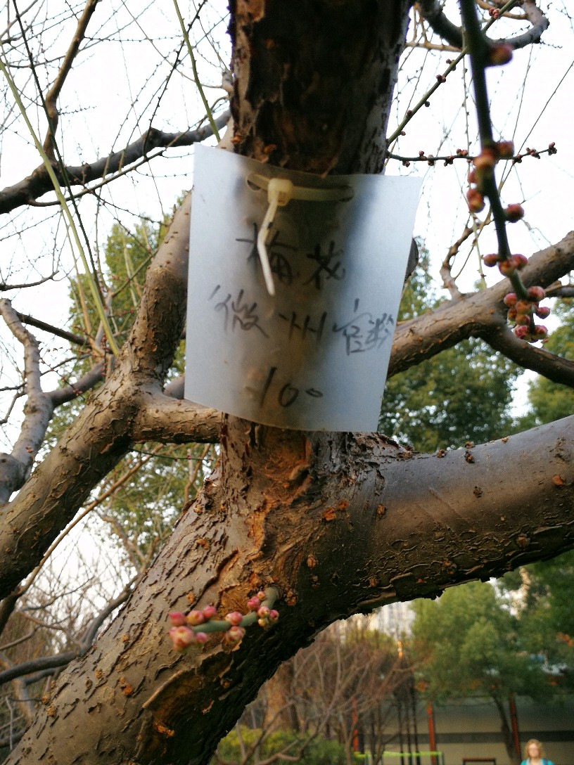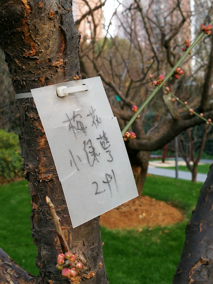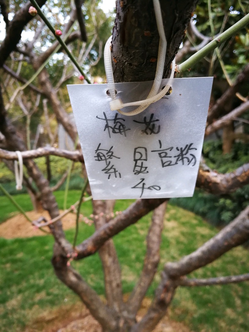 几乎每棵梅树上都挂了临时手写的牌子,也有的挂有比较正规的金属小牌,注明梅花的品种和编号,仔细一看,品种真不少,看得越来越迷茫了,因为本来想是牢牢记住它们的名字,结果看来不可能了:粉皮垂枝、异味绿萼、徽州宫粉、美人梅、八重唐梅、华农玉蝶、小绿萼、白须朱砂、繁星宫粉......等等等等