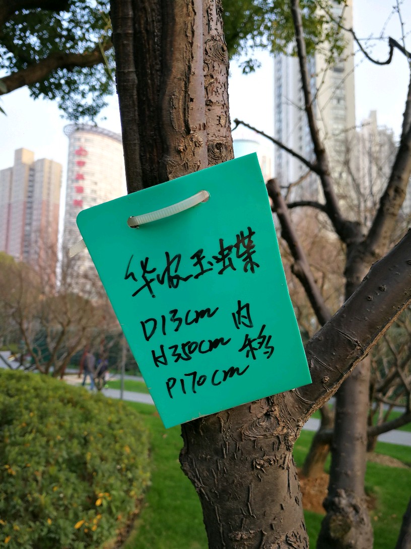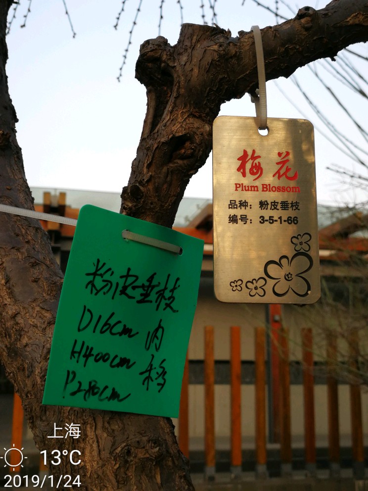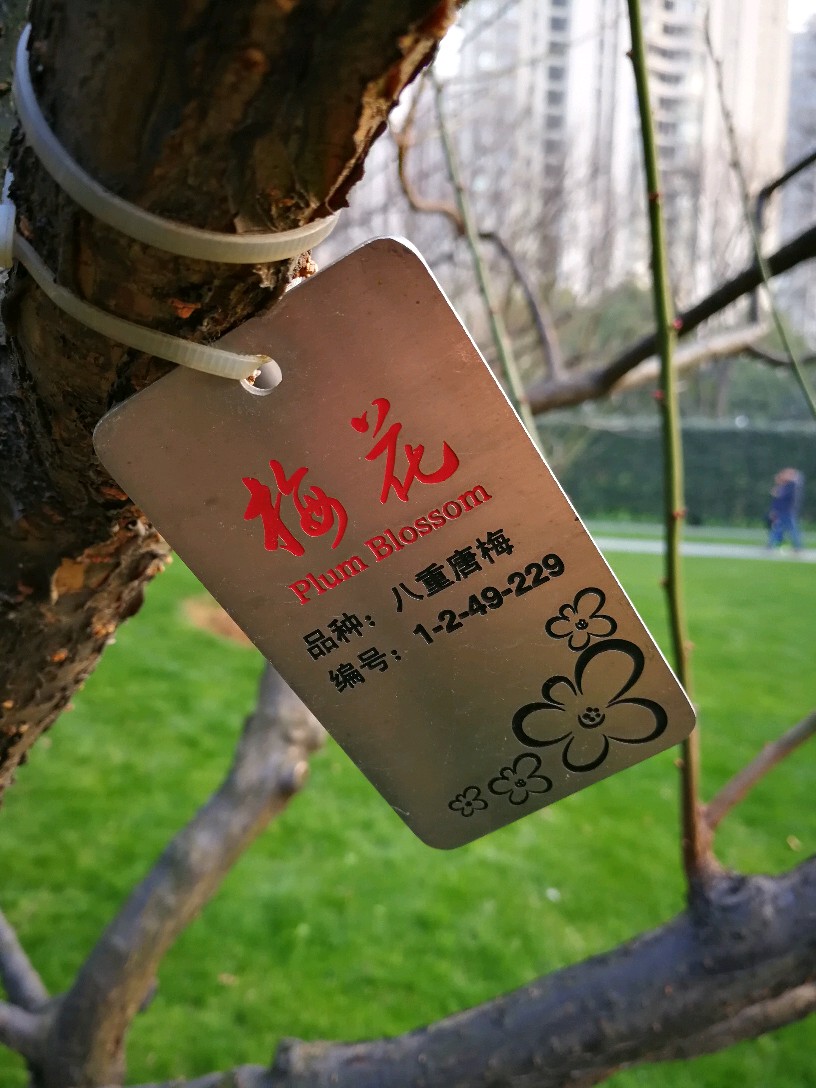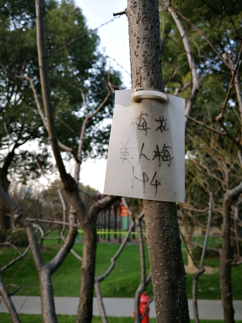 几乎每棵梅树上都挂了临时手写的牌子,也有的挂有比较正规的金属小牌,注明梅花的品种和编号,仔细一看,品种真不少,看得越来越迷茫了,因为本来想是牢牢记住它们的名字,结果看来不可能了:粉皮垂枝、异味绿萼、徽州宫粉、美人梅、八重唐梅、华农玉蝶、小绿萼、白须朱砂、繁星宫粉......等等等等