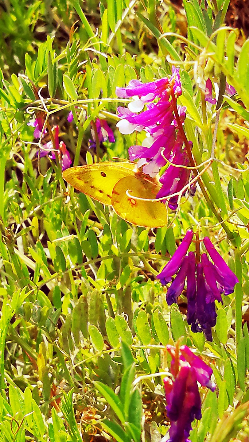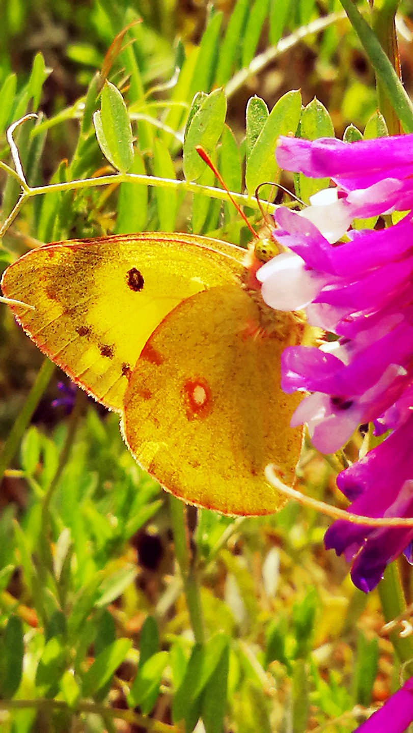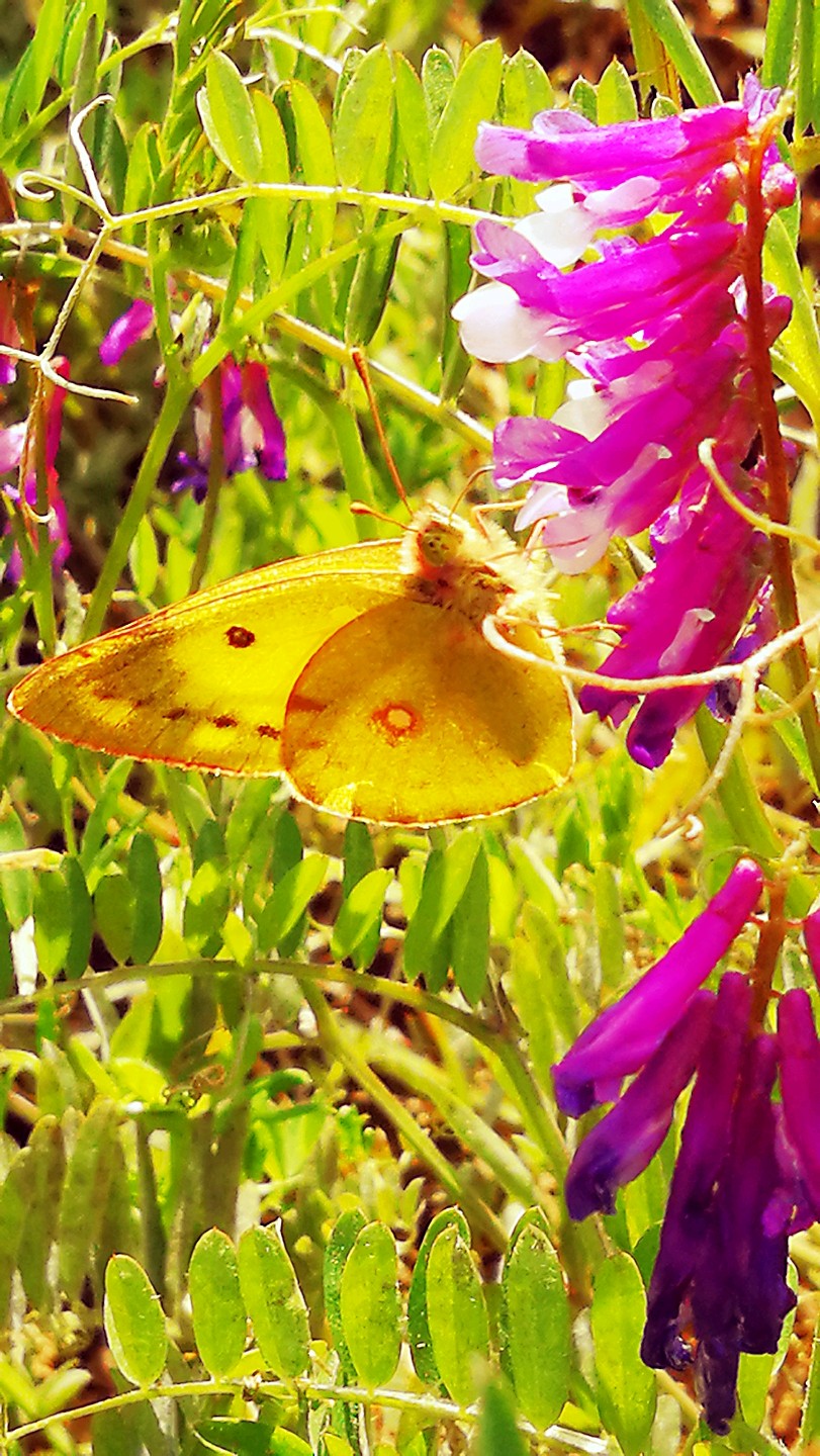 野豌豆花上吸蜜的橙黄豆粉蝶