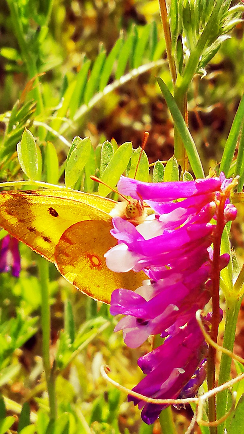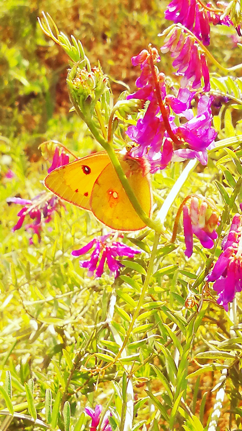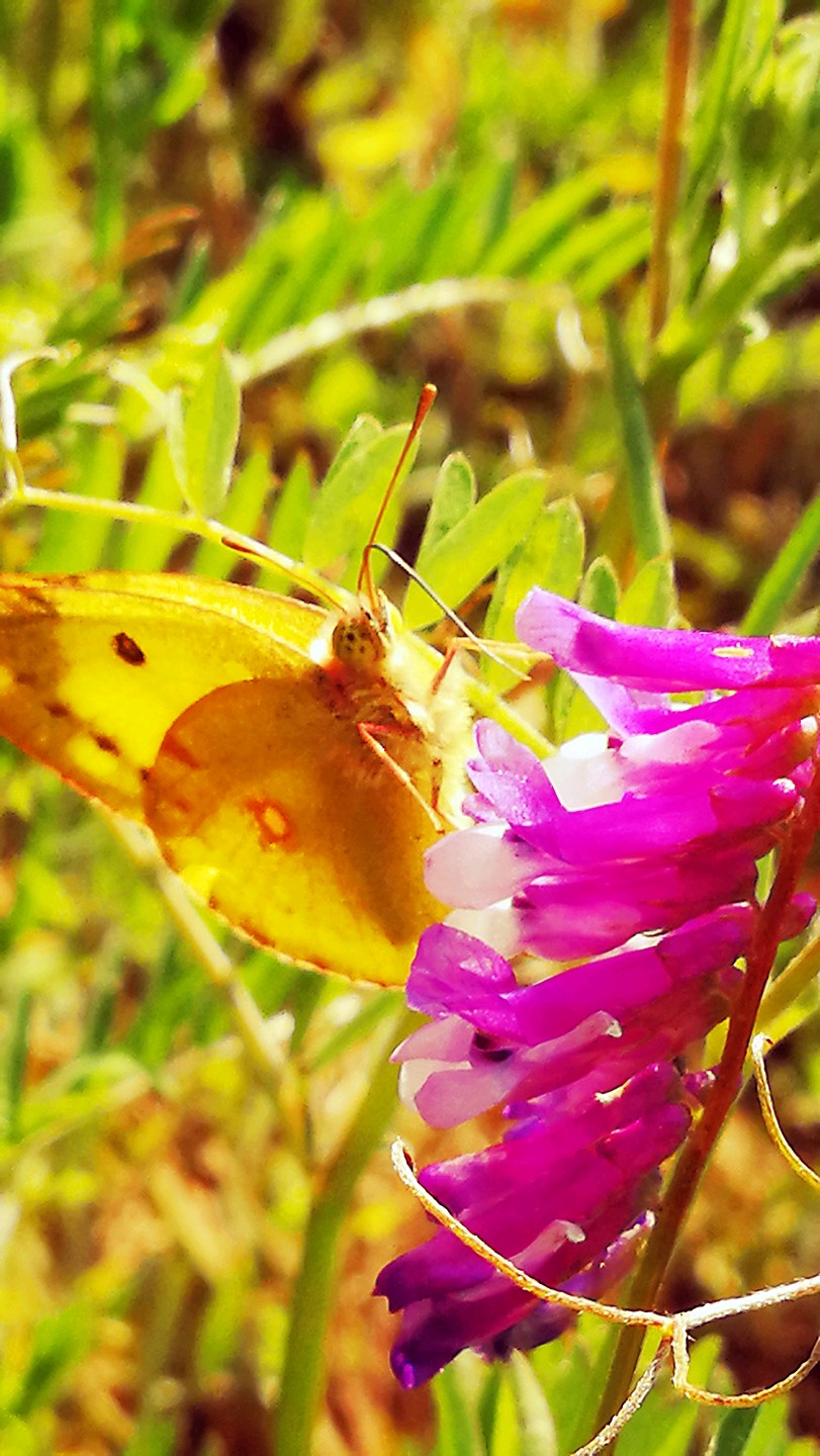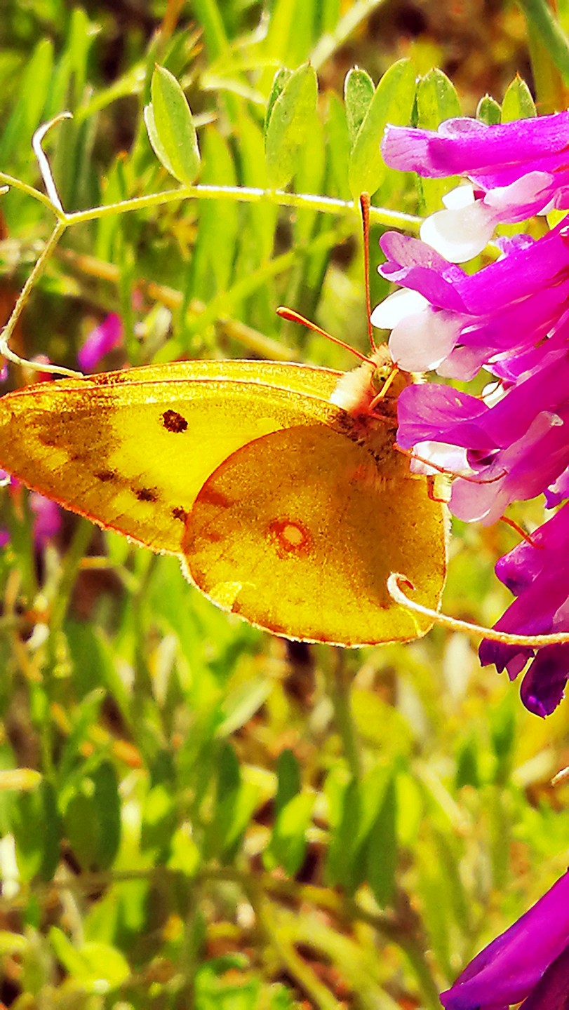 野豌豆花上吸蜜的橙黄豆粉蝶