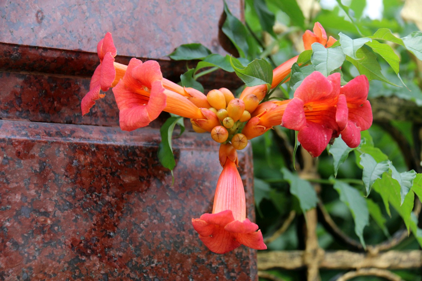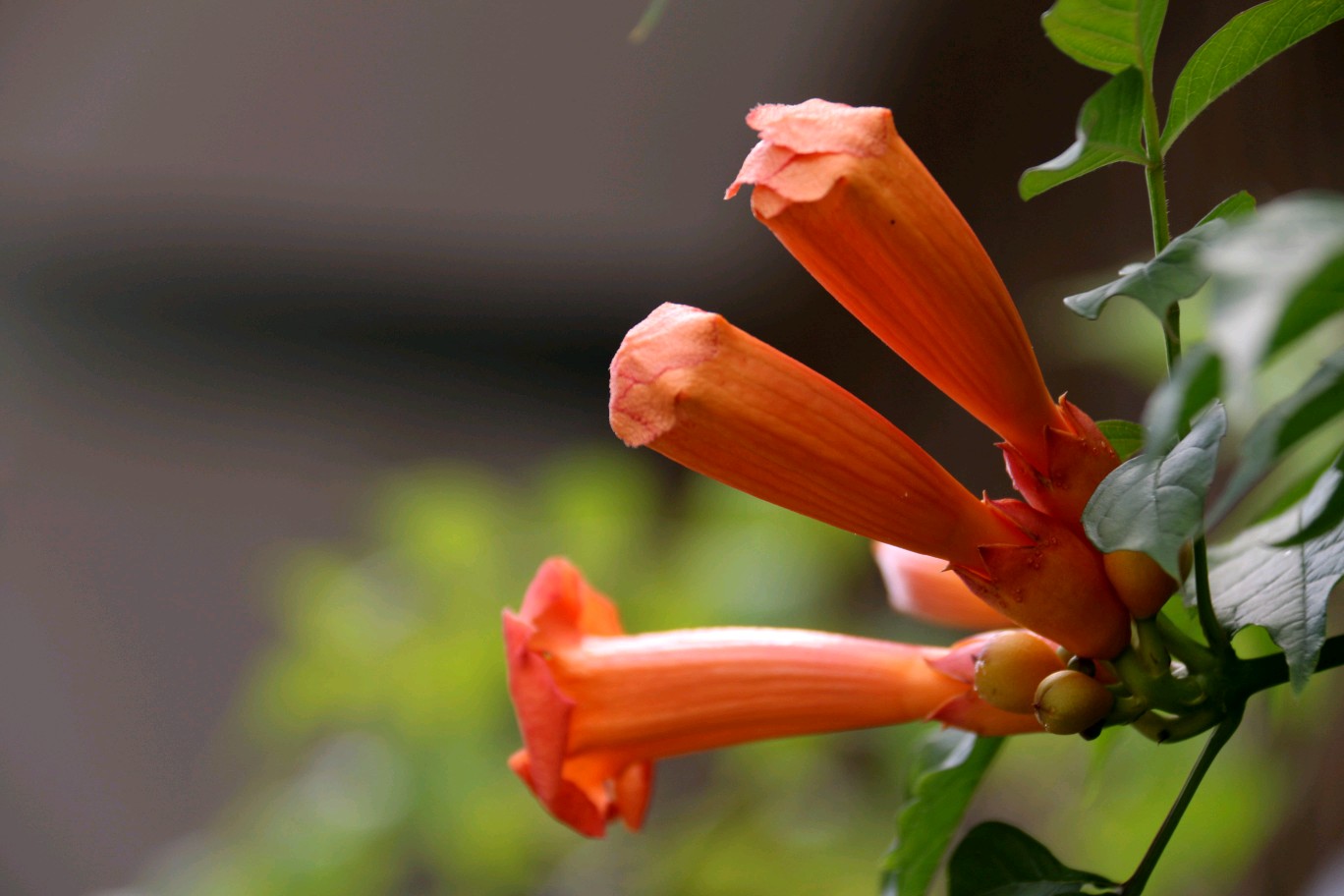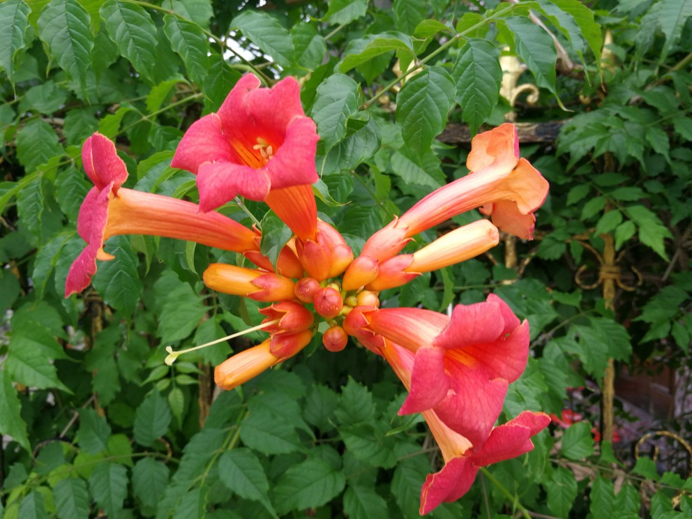 凌霄花,属攀援藤本植物。借气生根攀援它物向上生长,羽状复叶,小叶卵形7-9枚,边缘有锯齿,花鲜红色,花冠漏斗形,结蒴果。花期5-8月,。有药用价值,有行血去瘀、凉血祛风的功效,也具观赏价值。本地另见一种美国凌霄,名厚萼凌霄,小叶7~15枚,叶背脉间有细毛,花冠较小,筒长,橘红色。早于中国凌霄花一个月开花,花蕾长得可爱至极。