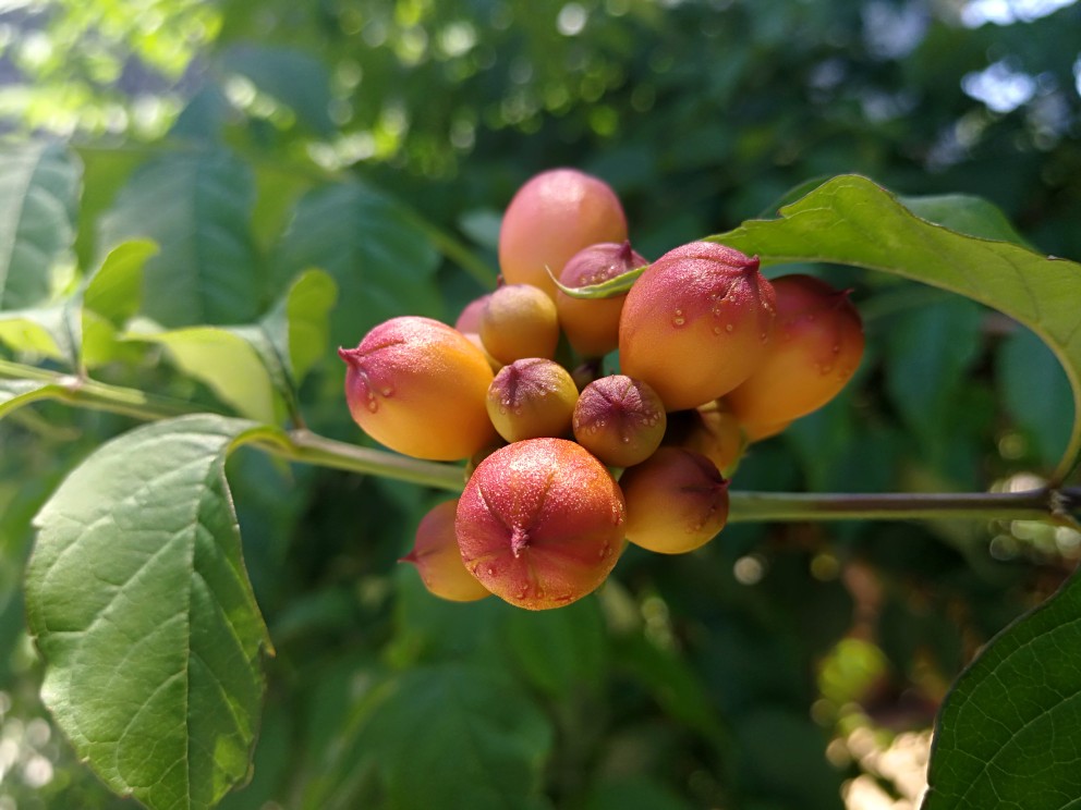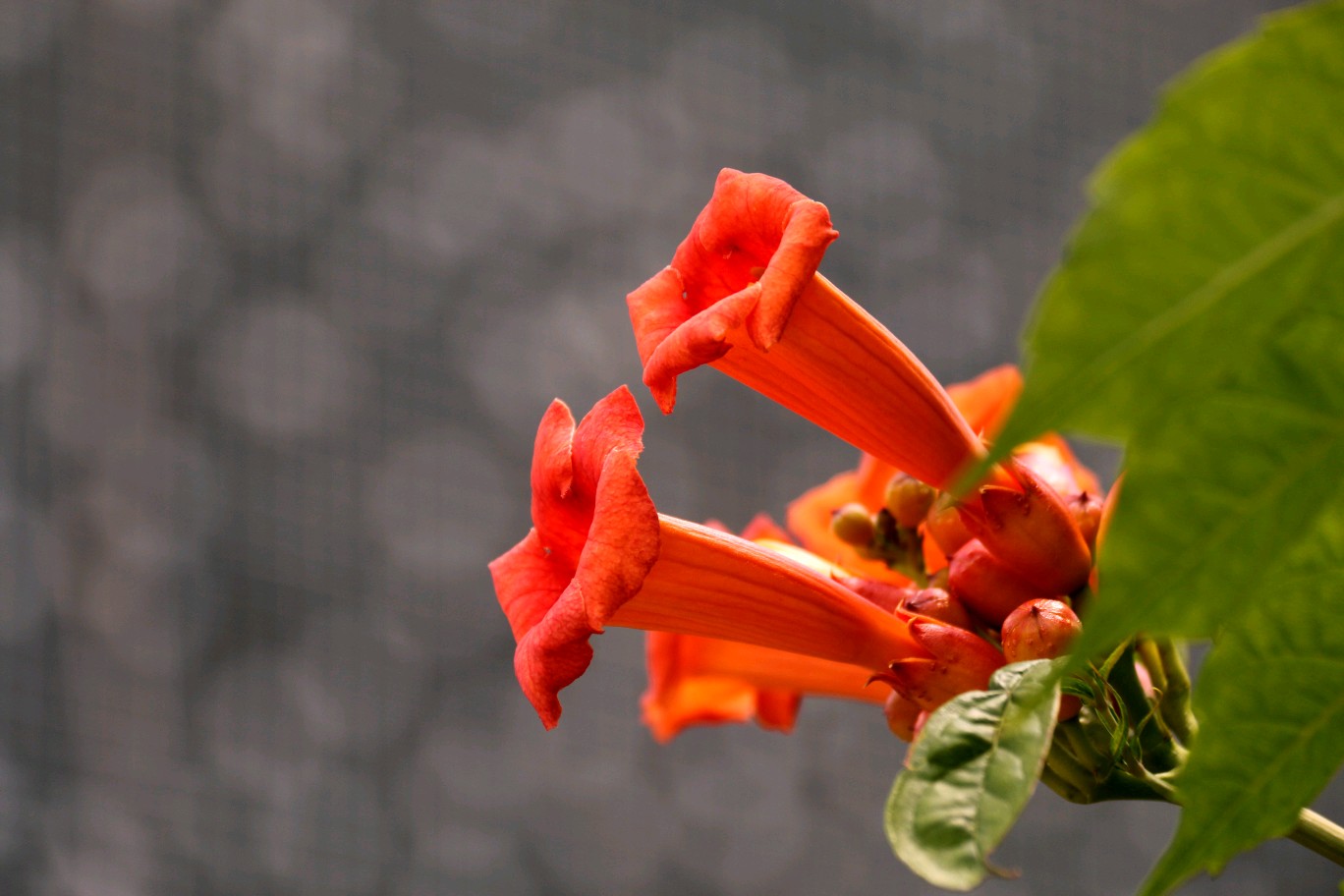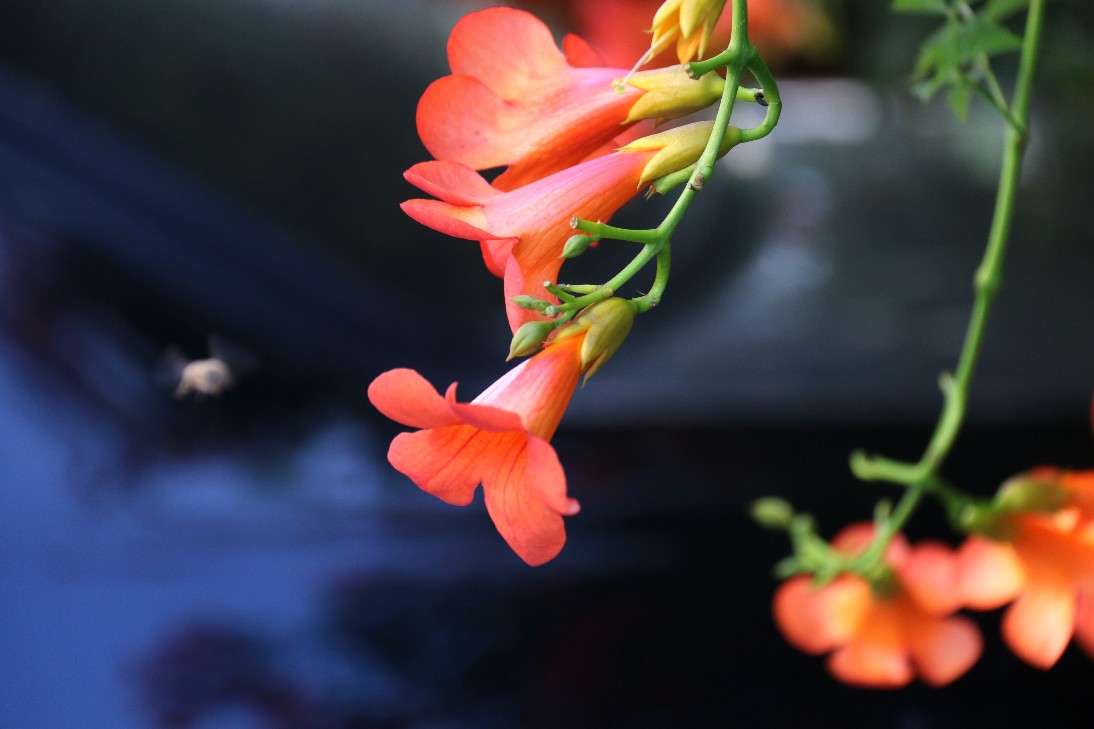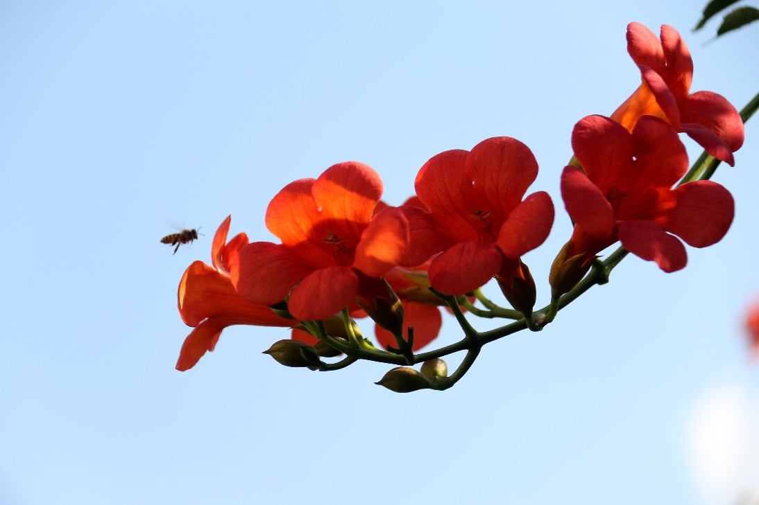 凌霄花,属攀援藤本植物。借气生根攀援它物向上生长,羽状复叶,小叶卵形7-9枚,边缘有锯齿,花鲜红色,花冠漏斗形,结蒴果。花期5-8月,。有药用价值,有行血去瘀、凉血祛风的功效,也具观赏价值。本地另见一种美国凌霄,名厚萼凌霄,小叶7~15枚,叶背脉间有细毛,花冠较小,筒长,橘红色。早于中国凌霄花一个月开花,花蕾长得可爱至极。