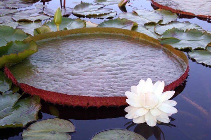 王莲是睡莲家族的成员,所谓“王莲”,就是莲花之王。王莲是水生有花植物中叶片最大的,热带著名水生庭园观赏植物,它圆形的叶片像一个个大圆盘浮在水面上,每片叶子最大的直径可达3米左右。因其叶脉与一般植物的叶脉结构不同,成肋条状,似伞架,所以具有很大的浮力。
