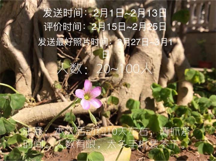 🌈发送:2月1日~2月13日 评价:2月15日~2月25日 发送最好照片:2月27日~3月1日 人数:20~100人 🌸注意:本次活动约10天左右,请抓紧时间。人数有限……(看上面的图片)
