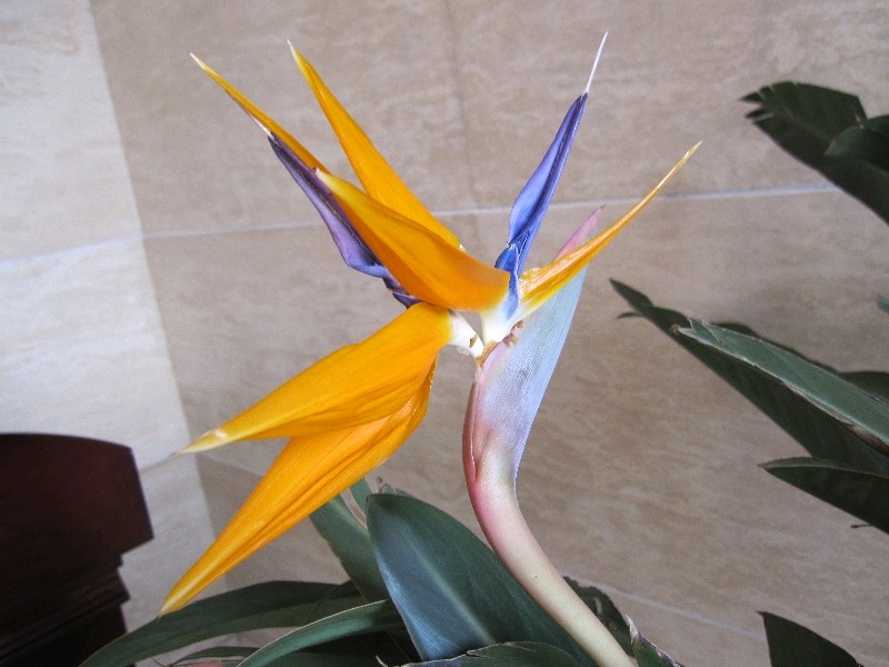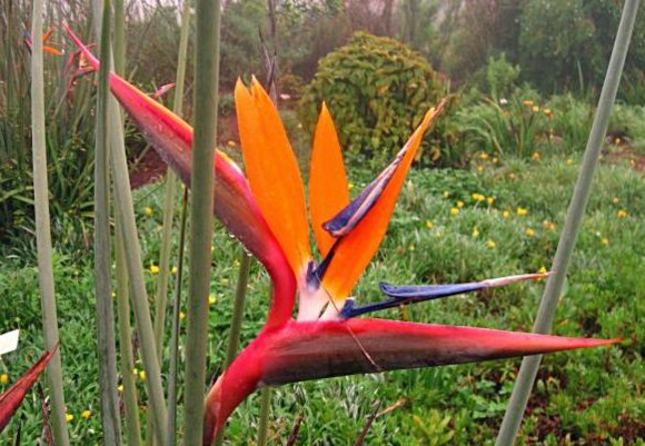 无叶鹤望兰株高1米左右,叶呈棒状,花大,花萼橙红色,花瓣紫色。