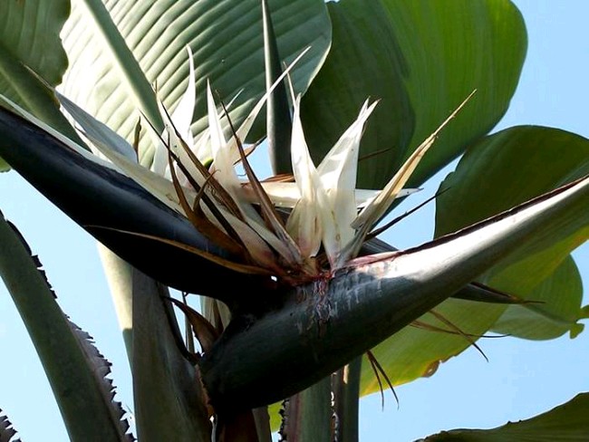 白花天堂鸟:丛生状,叶大。花大,花萼白色,花瓣淡蓝色。