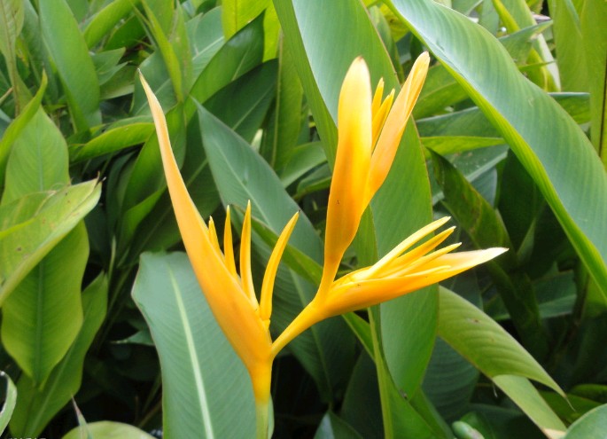 金色鹤望兰:株高1.8米,花大,花萼、花瓣均为黄色。