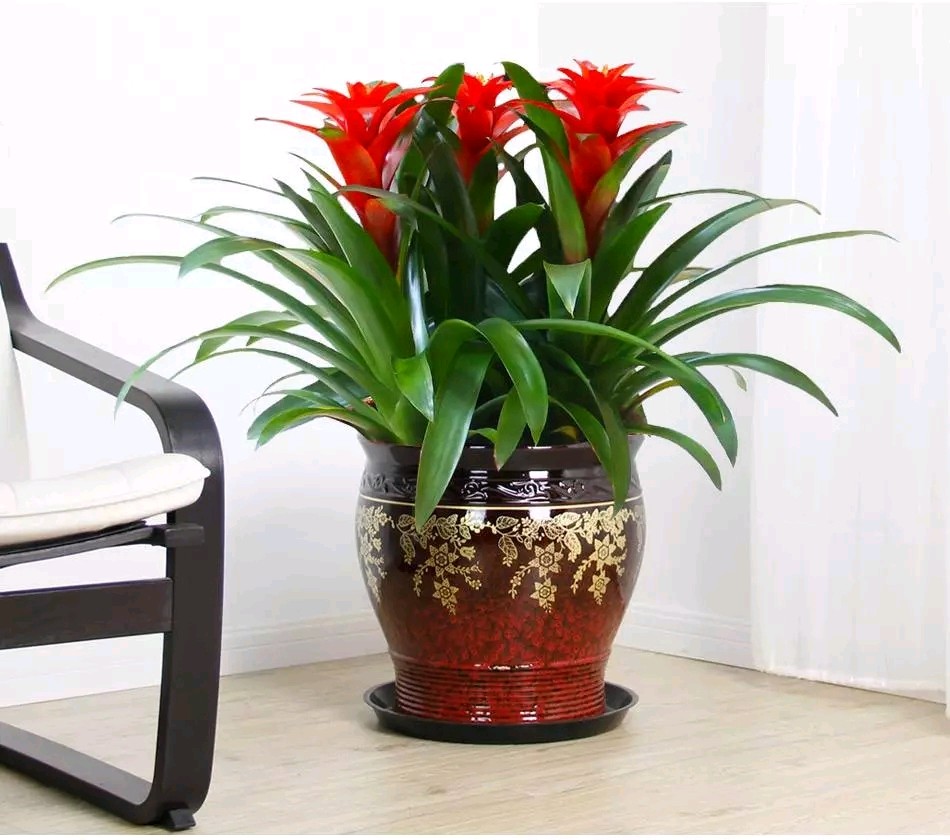 这是一种凤梨科的植物。它的花儿会在其顶部或者中间开放。它的花儿颜色红彤彤的,一看就有着喜庆的气氛。因而,它的招财能力也不错。