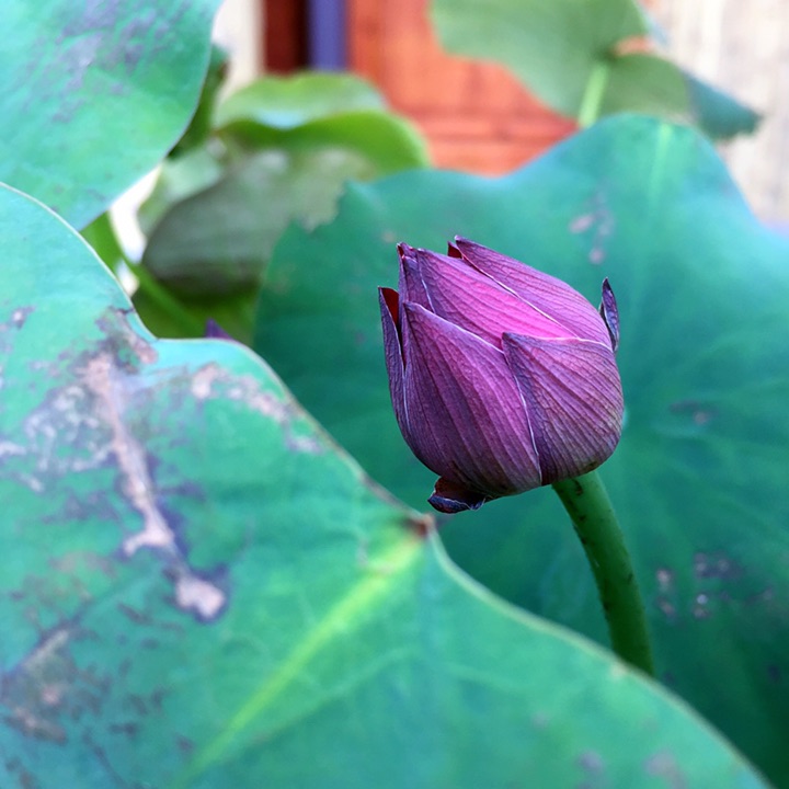 一户农家山庄门前水缸里养着含苞待放的荷花。别忘了荷叶也是一味清暑利湿的良药噢!