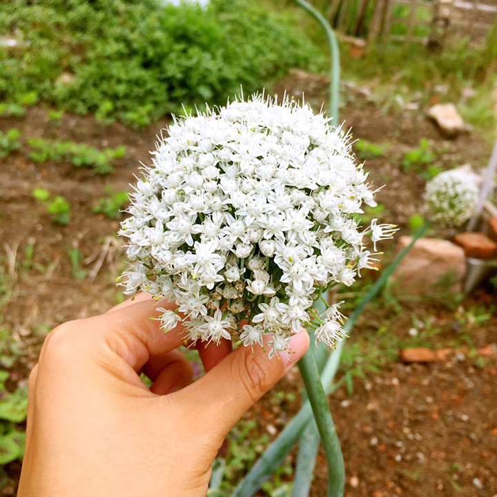 长在菜圃里的巨无霸大葱,白色的花球简直有拳头大!