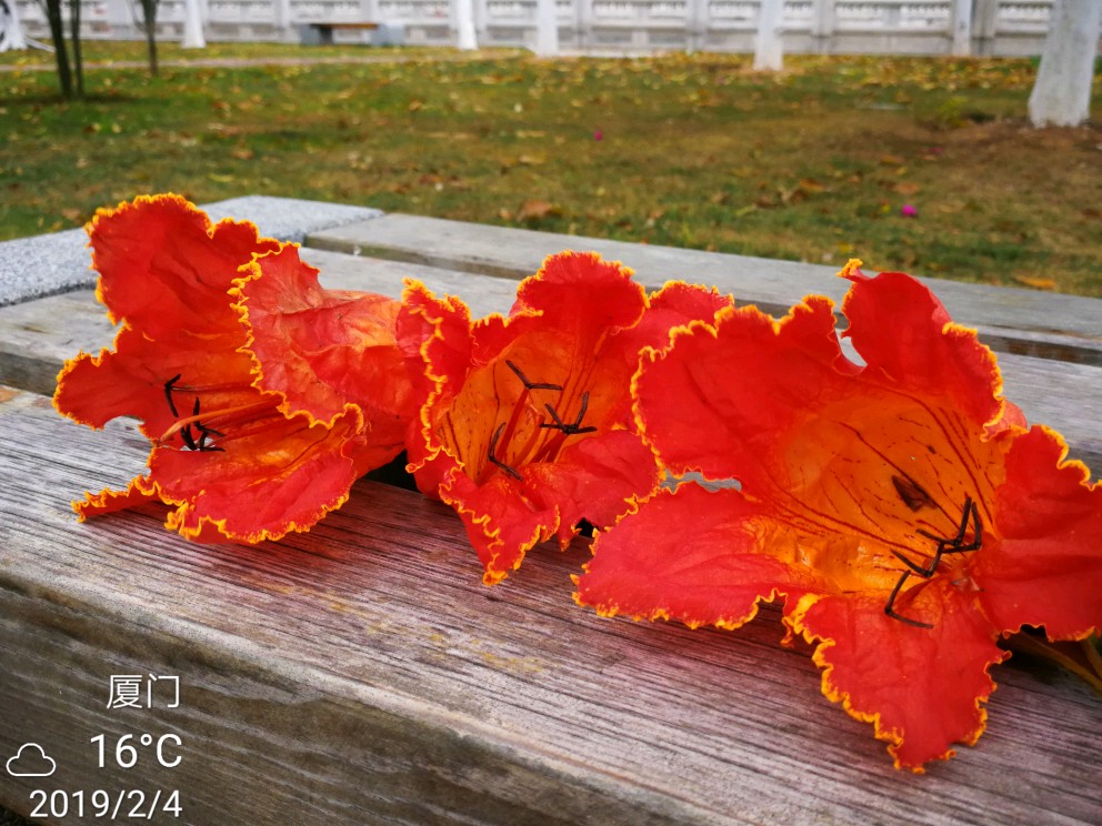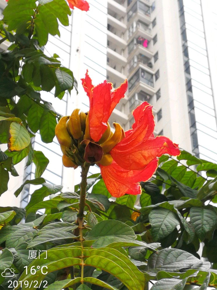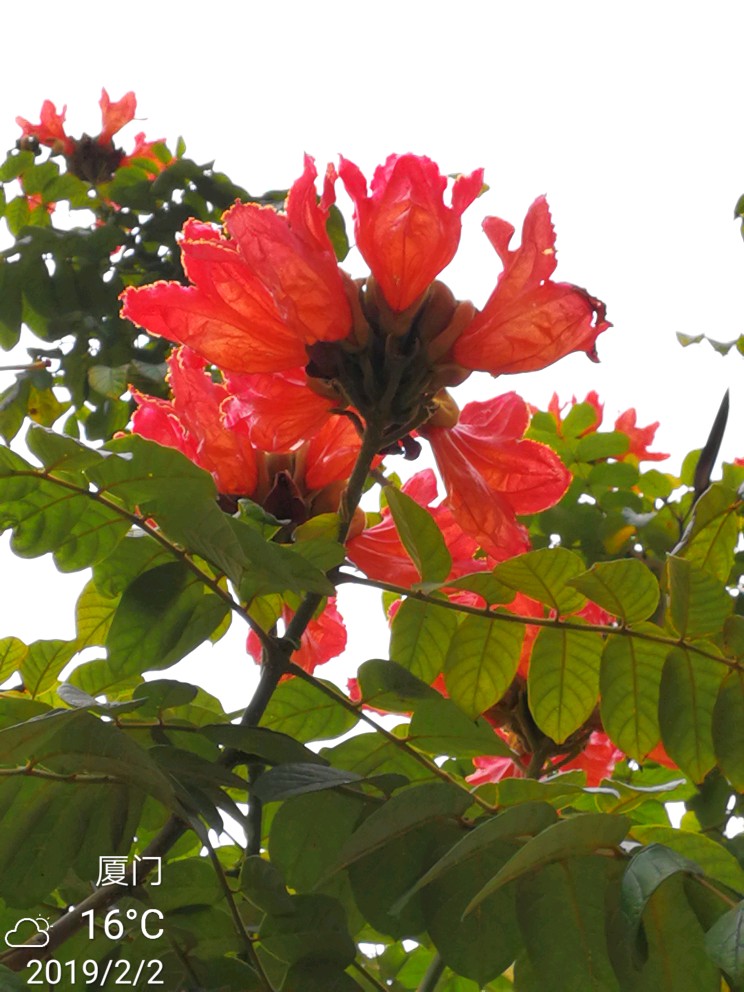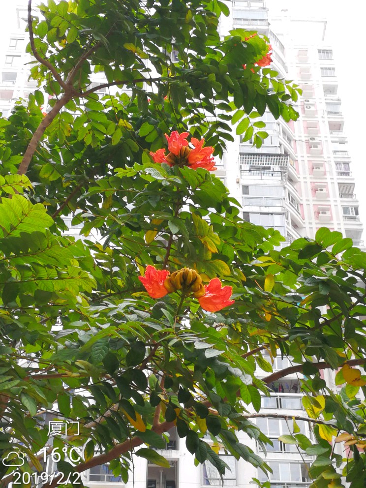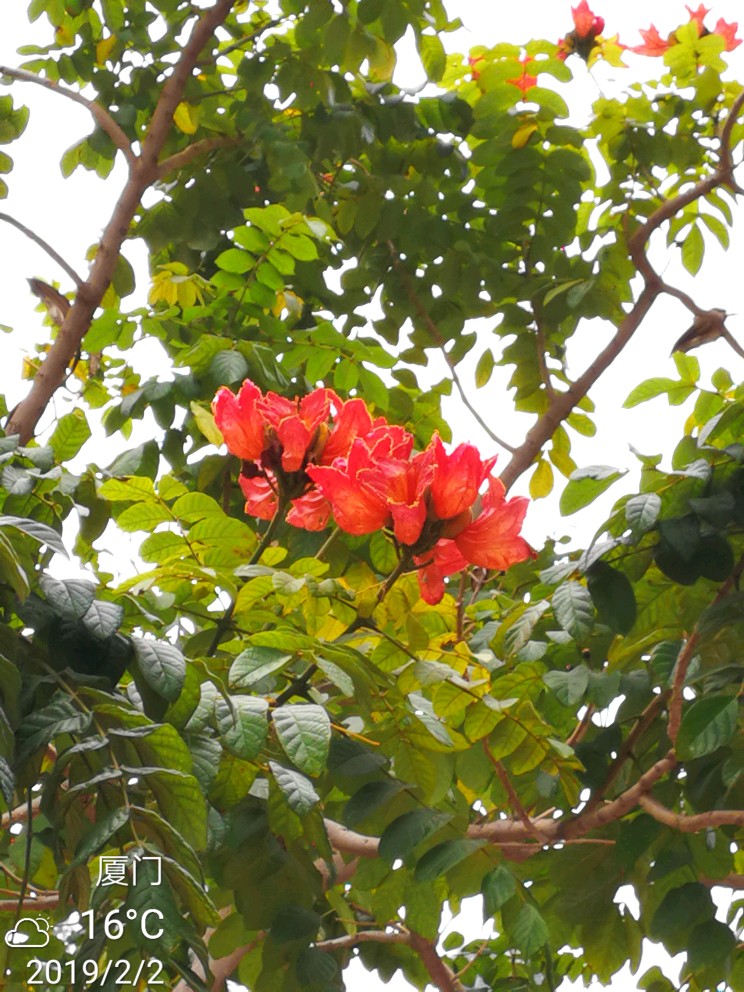 春节前来到厦门,第一印象最深的街道两边的火焰树。鲜红的花朵高高大大开在树上,非常显眼。这个树和花之前没有见过,还是南方的好友告诉我的,说这是南方最常见的树木。