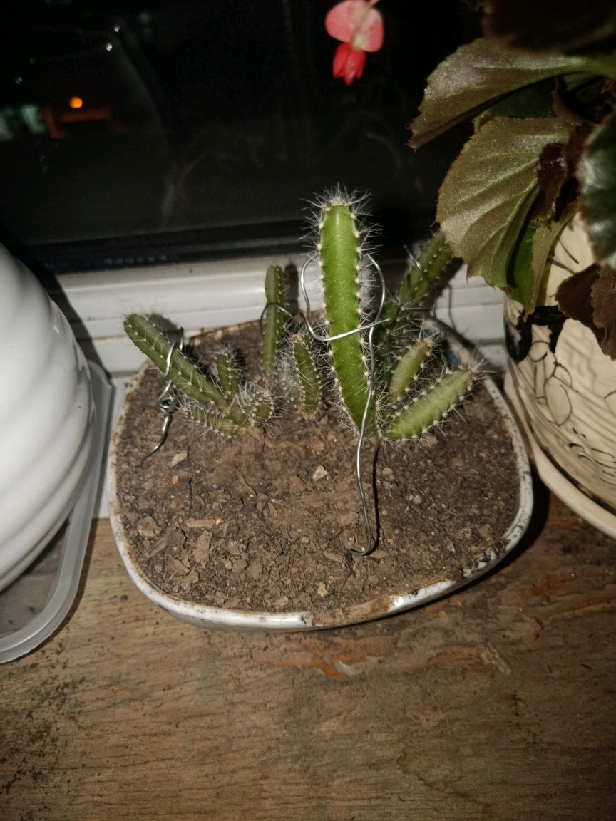 我给我们家倒了的火龙果给拴上铁丝啦。