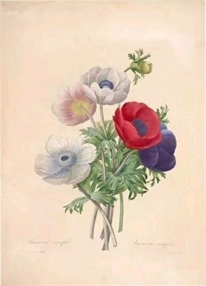 今天😊,这一幅画还是比利时🇩🇪著名花卉画家雷杜德画的,他画的这六朵美丽的欧洲银莲花,花瓣的颜色和花蕊🌸的颜色都完全不相同,但是都是同样的美丽动人,而且全部都在向我们展示它们美丽的容颜,叶子非常非常的卷曲,我感觉是叶子在抱着美丽的花儿们。