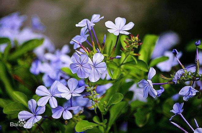 蓝花丹(学名:Plumbago auriculata)是常绿柔弱半灌木,上端蔓状或极开散,高约1米或更长。叶薄,通常菱状卵形至狭长卵形。穗状花序约含18-30枚花;总花梗短;苞片线状狭长卵形,花冠淡蓝色至蓝白色,冠檐宽阔,裂片倒卵形,先端圆;子房近梨形,有5棱。花期6-9月和12-4月。在中国华南、华东、西南和北京常有栽培。原产南非南部,已广泛为各国引种作观赏植物。