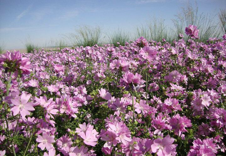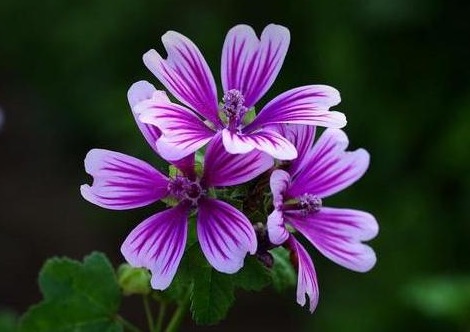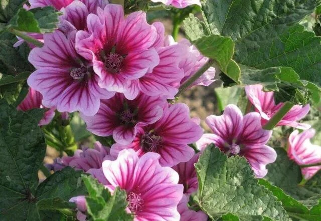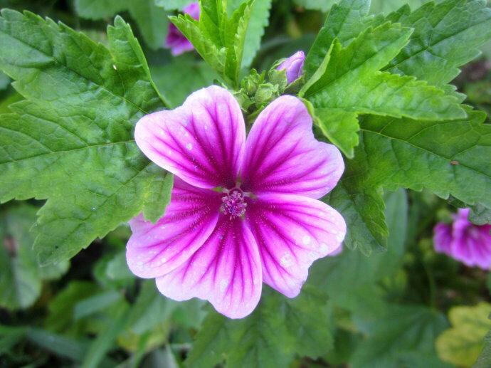 锦葵(学名:Malva sinensis Cavan.):二年生或多年生直立草本,高50-90厘米,分枝多,疏被粗毛。叶圆心形或肾形,具5-7圆齿状钝裂片,两面均无毛或仅脉上疏被短糙伏毛。花3-11朵簇生,小苞片3,长圆形疏被柔毛;花紫红色或白色,直径3.5-4厘米,花瓣5,匙形,长2厘米,先端微缺,爪具髯毛。果扁圆形,分果爿9-11,肾形,被柔毛;种子黑褐色,肾形,长2毫米。花期5-10月。花供园林观赏,地植或盆栽均宜;其花白色的常入药用。中国南北各城市常见的栽培植物,偶有逸生。南自广东、广西,北至内蒙古、辽宁,东起台湾,西至新疆和西南各省区,均有分布。印度也有。