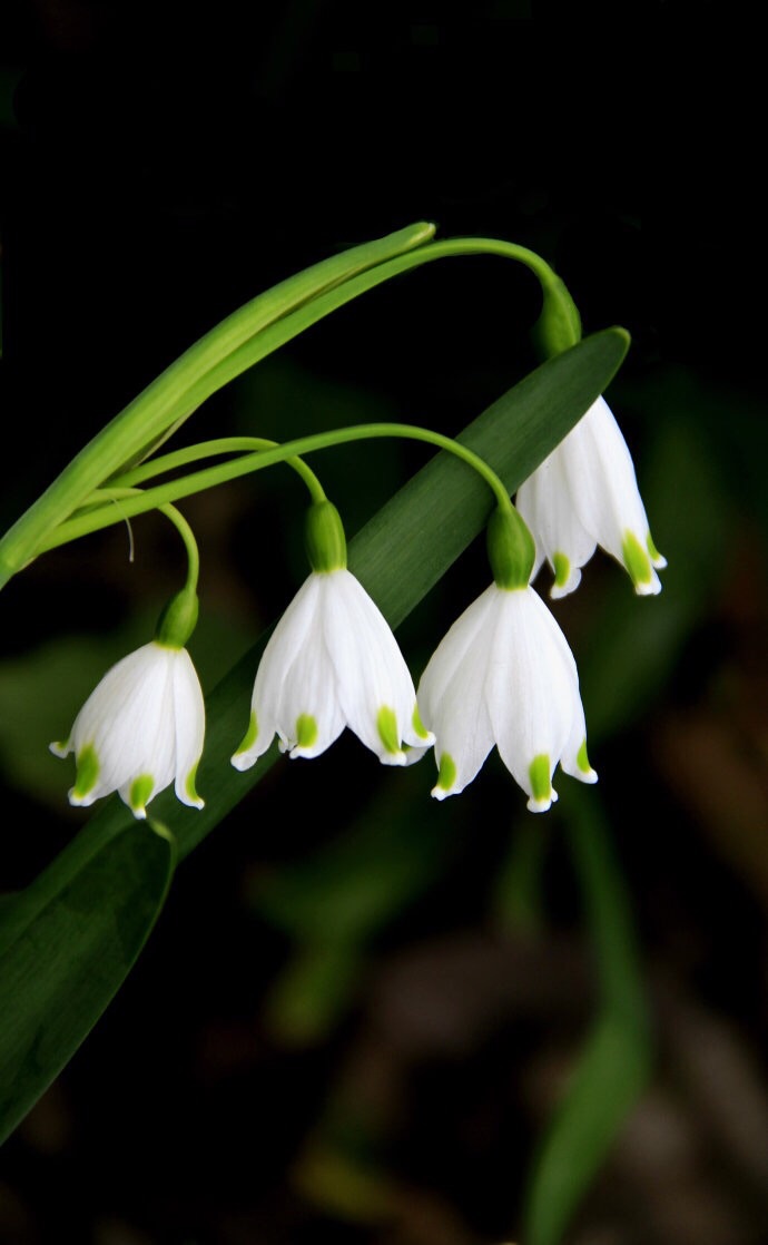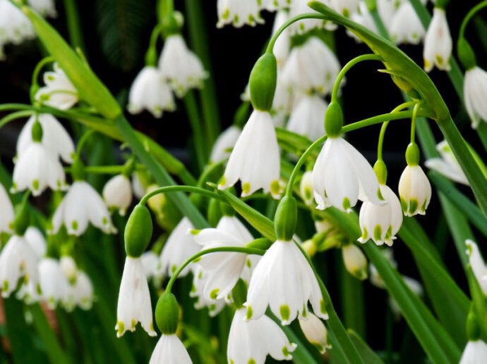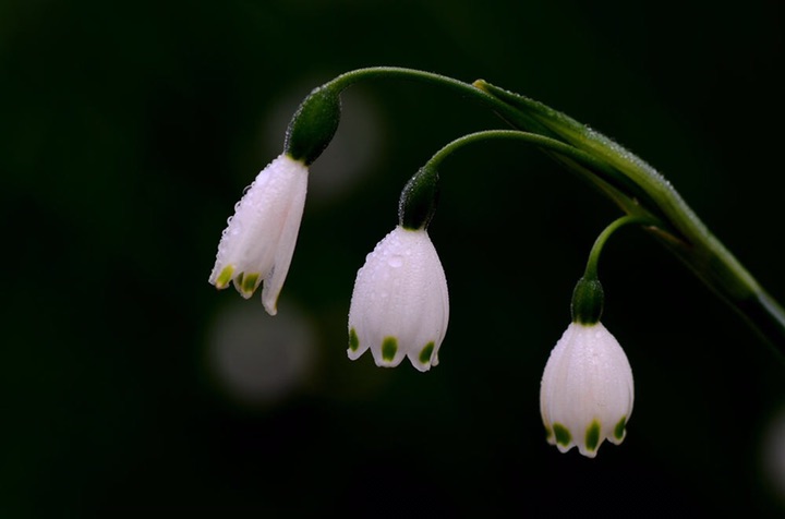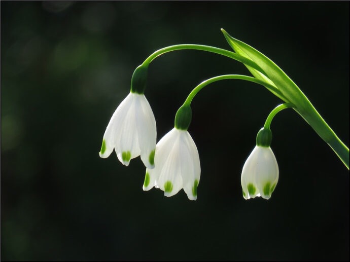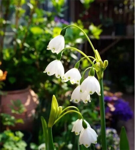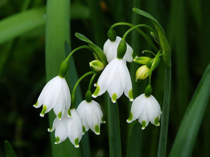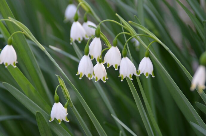 夏雪片莲是石蒜科雪片莲属,多年生球根植物。植株高24~36cm。叶深绿、长剑形。花茎细长,顶端白色花冠下垂,呈灯罩形,各花瓣的端尖都带有绿色的斑纹。花期为晚春至早夏。喜欢全日照。此种植物花形十分美丽动人,是喜欢极湿条件的球根花卉之一。虽然是沼泽园中常见的一种植物,但在野外多生于溪流边沿。