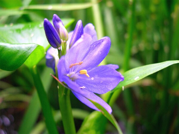 雨久花(学名:Monochoria korsakowii Regel & Maack)直立水生草本;根状茎粗壮,具柔软须根。茎直立,全株光滑无毛,基部有时带紫红色。叶基生和茎生;基生叶宽卵状心形,全缘,具多数弧状脉;叶柄有时膨大成囊状;茎生叶叶柄渐短,基部增大成鞘,抱茎。总状花序顶生,有时再聚成圆锥花序;花具5-10毫米长的花梗;花被片椭圆形,蓝色;雄蕊6枚,花药浅蓝色,花丝丝状。蒴果长卵圆形。种子长圆形,有纵棱。花期7-8月,果期9-10月。