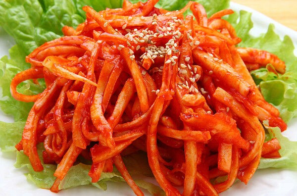 首先把去皮的桔梗用凉水泡,泡到没有苦味为止,然后将桔梗切成细条,撰干水,放入糖、盐、姜末、蒜末、味精、最重要的是辣椒酱,然后腌制1~2天就可以吃了。是不是感觉很简单呢?