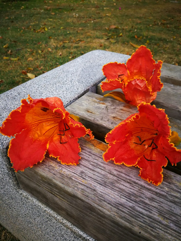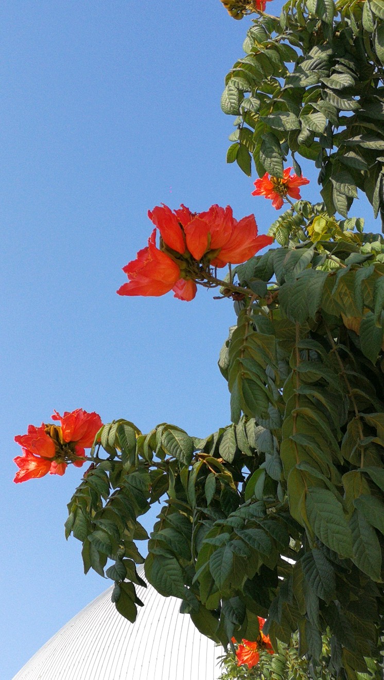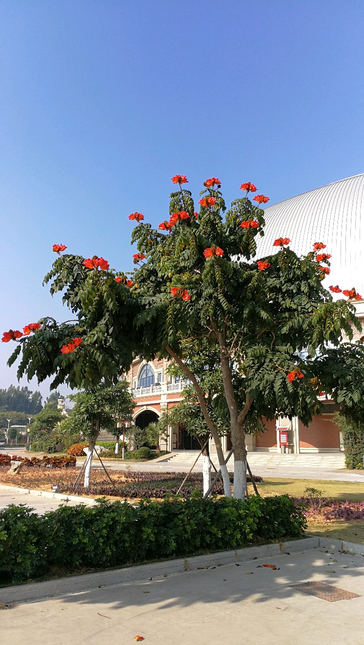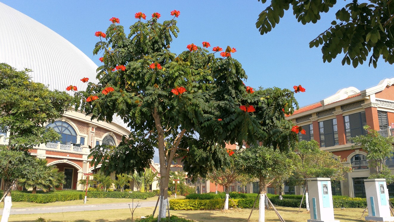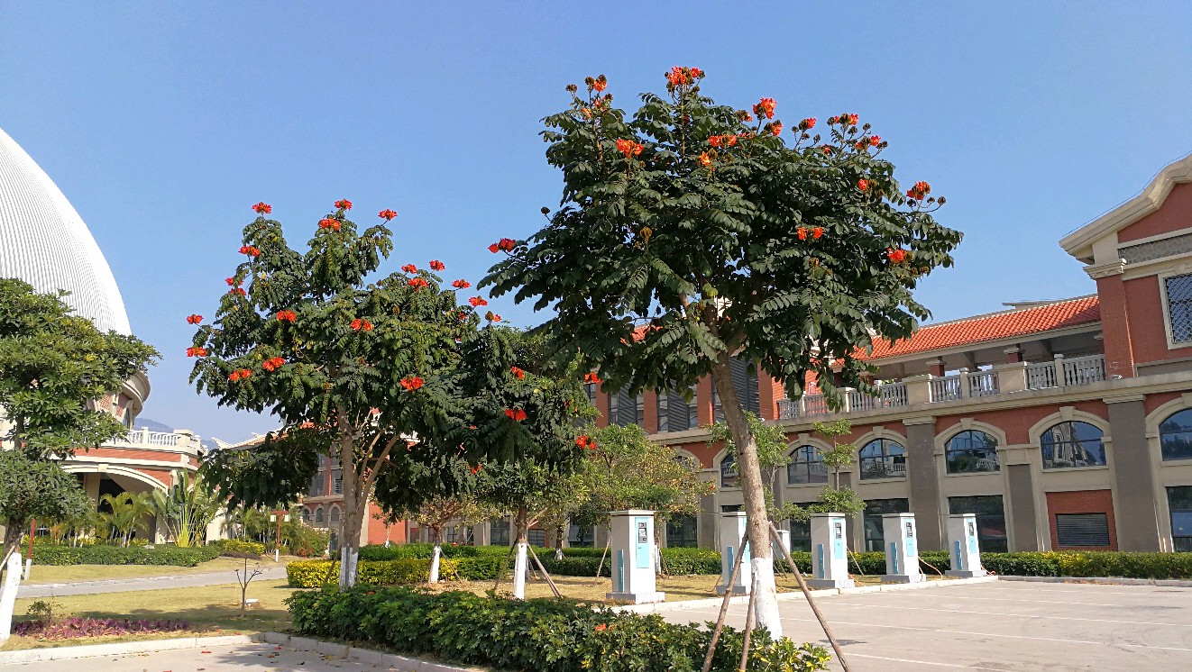 话说厦门有个景点“老院子”,原以为是那种古色古香、有些年代的老建筑群,就高高兴兴跑去了,到了之后才知道,此乃人造景点,完全不合我的兴趣,就没有进去,只在大门口瞧了瞧“比武招亲”的表演,看不下去了,准备撤退。一转身来到一个剧院后边,倒是几株火焰树再次吸引了我。(外出不做攻略不行啊)。