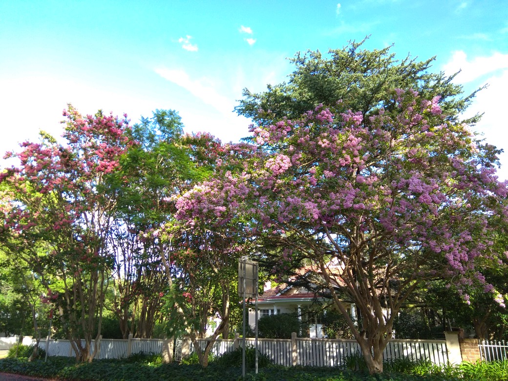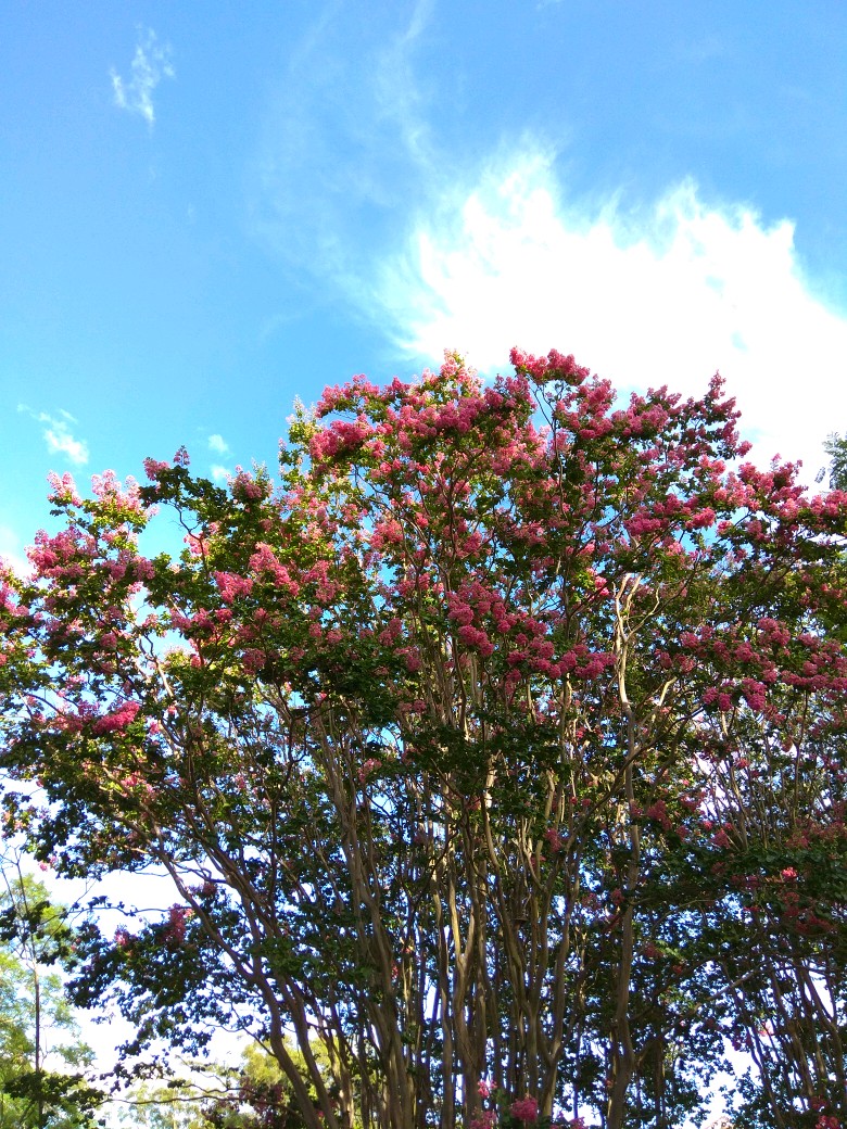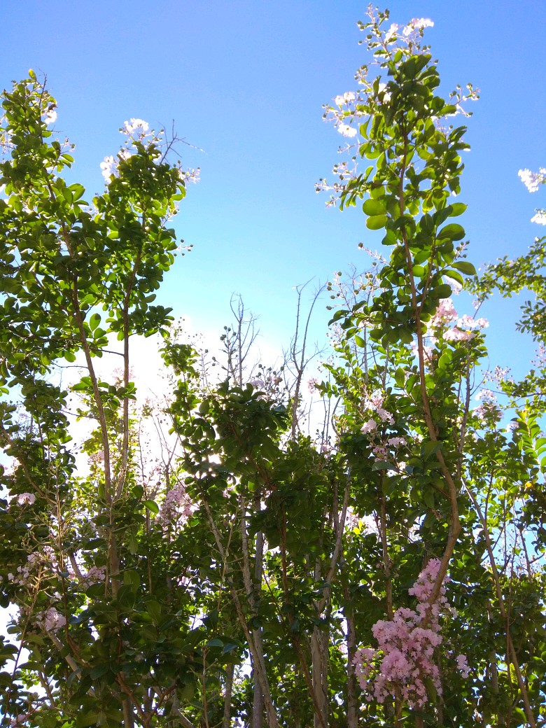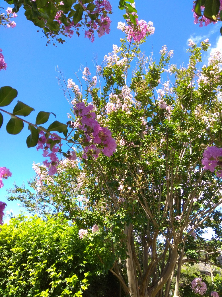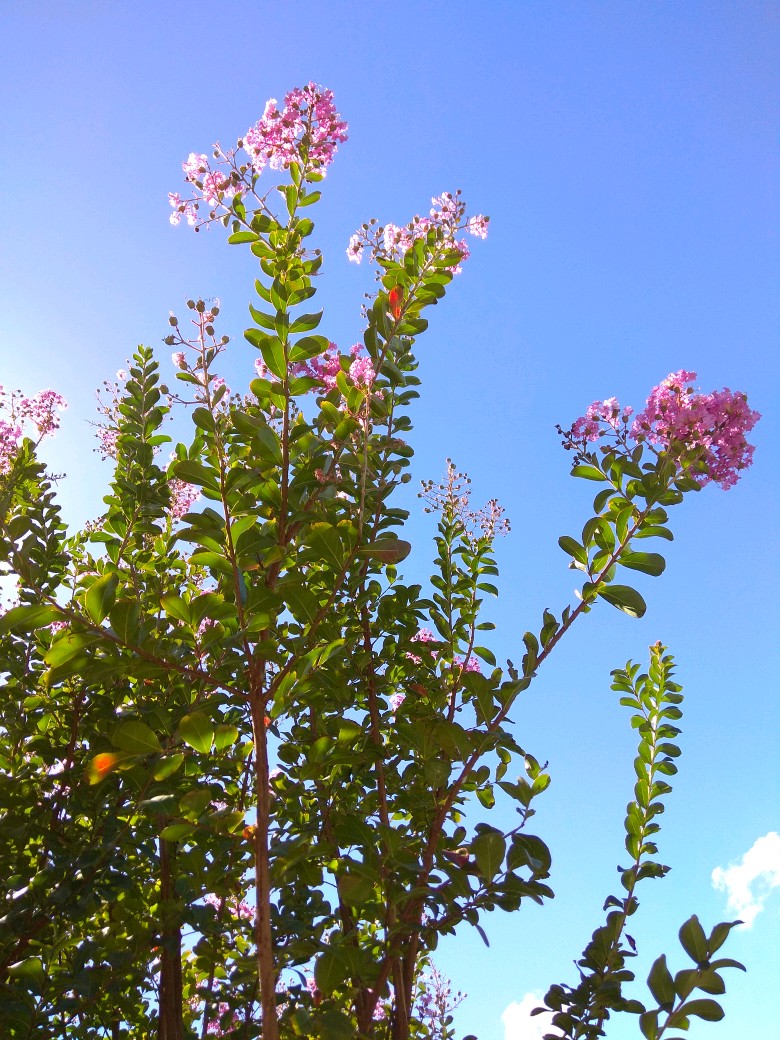 今夏真热,两个月来反反复复40°C很多次了,紫薇却开得从来没有的好。最喜欢晴空配紫薇了