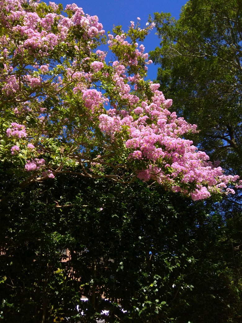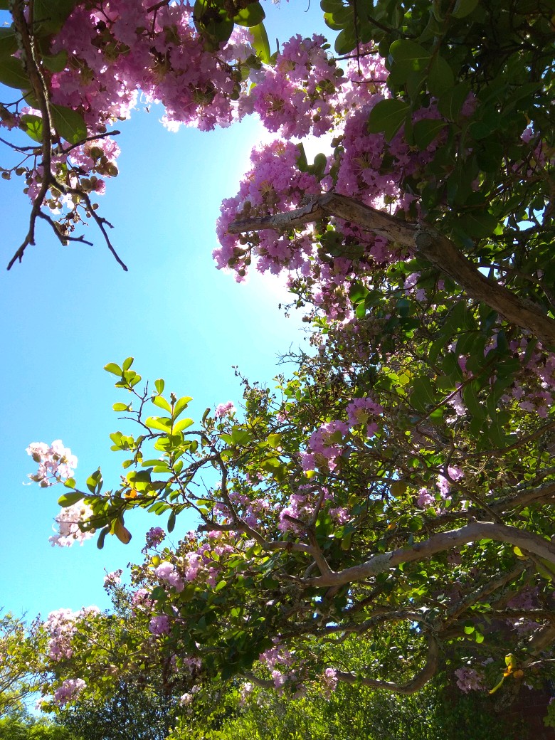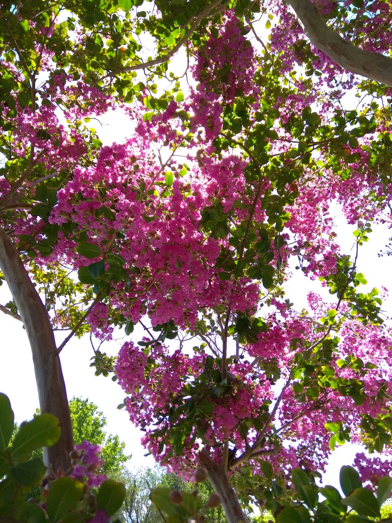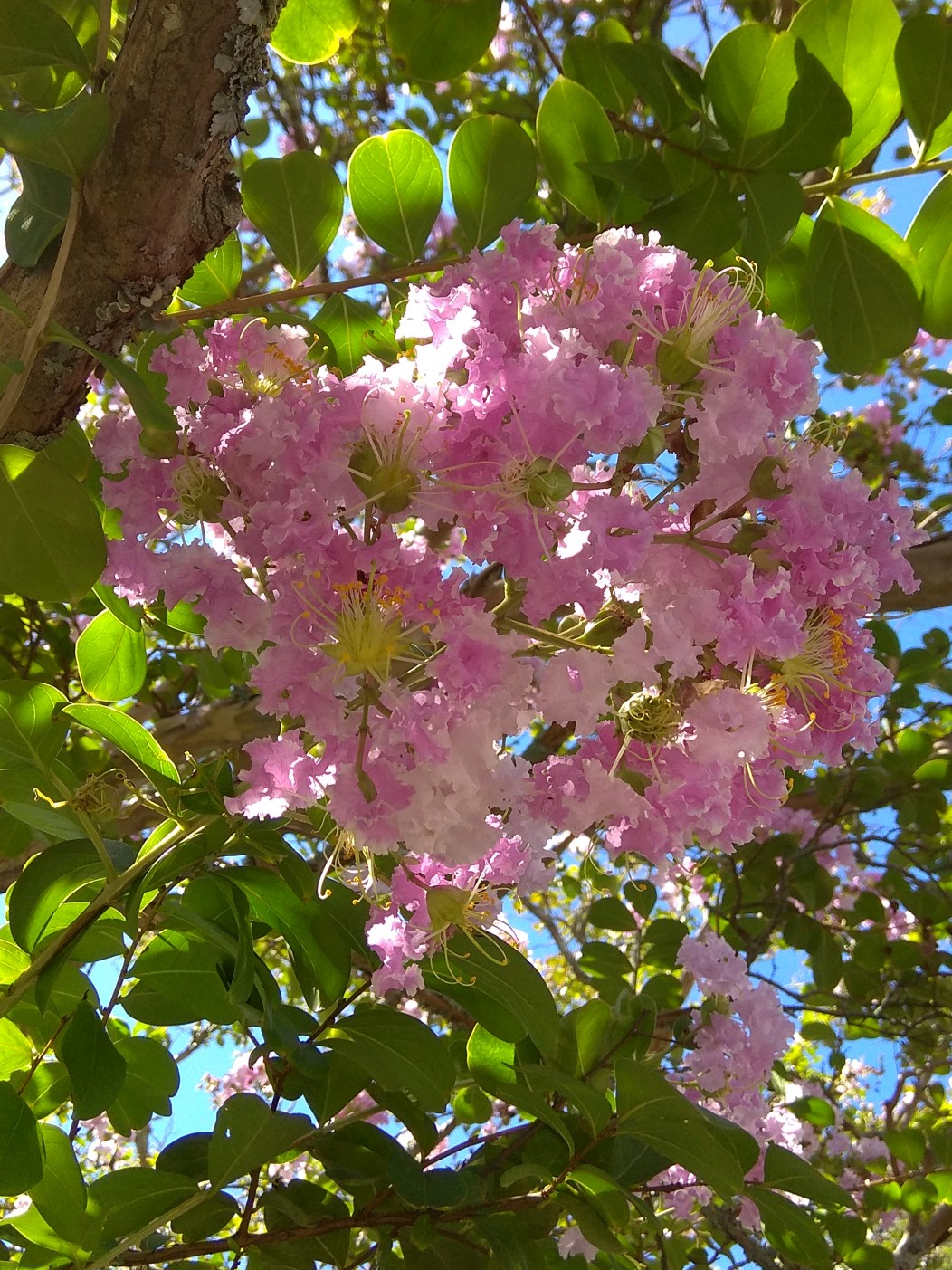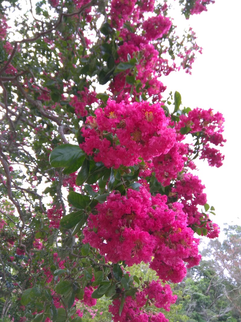 今夏真热,两个月来反反复复40°C很多次了,紫薇却开得从来没有的好。最喜欢晴空配紫薇了