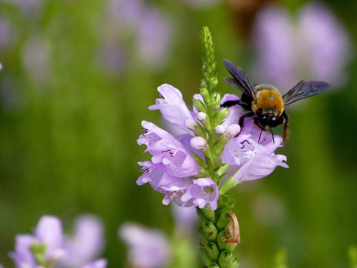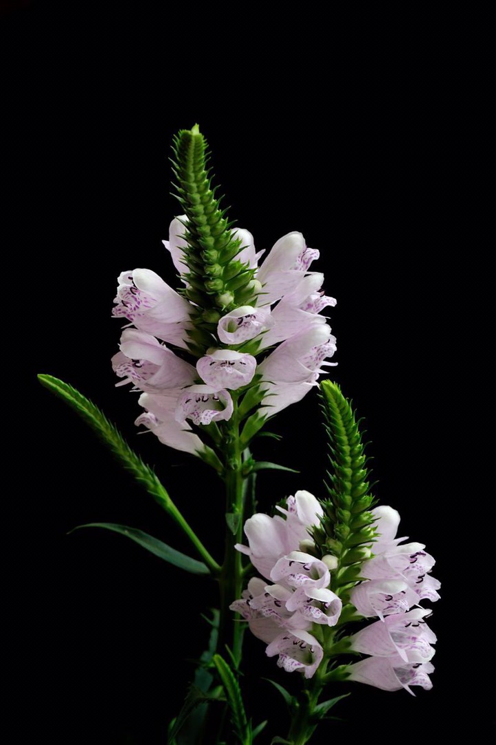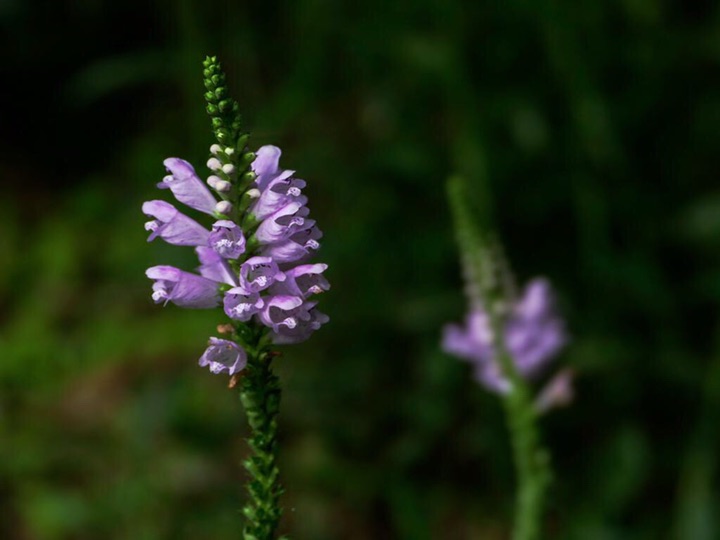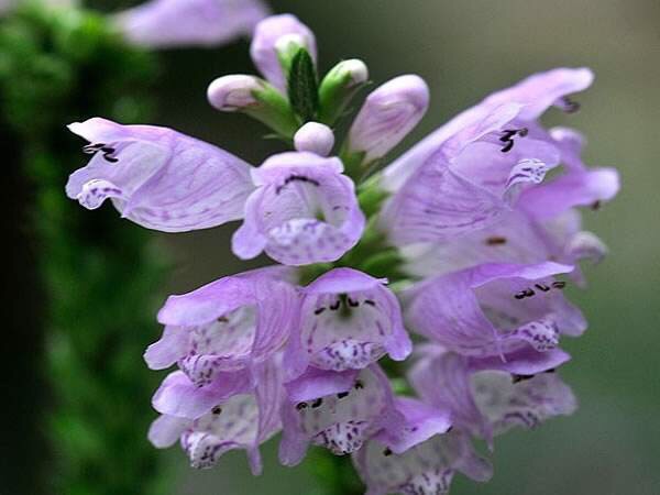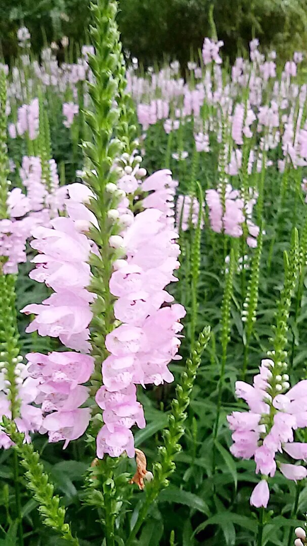 假龙头花Physostegia virginiana,属多年生宿根草本。茎丛生而直立,四棱形,株高可达0.8米。单叶对生,披针形,亮绿色,边缘具锯齿。穗状花序顶生,长20厘米至30厘米。每轮有花2朵,花筒长约2.5厘米,唇瓣短,花色淡紫红,因其花朵排列在花序上酷似芝麻的花,惟密度稠一些,故名芝麻花。花期7月至9月。