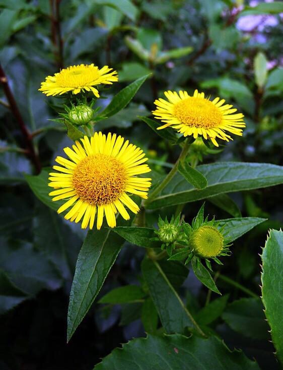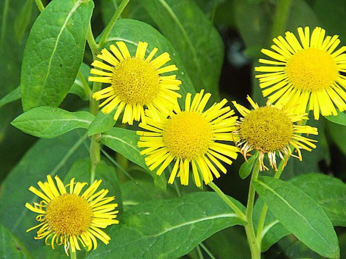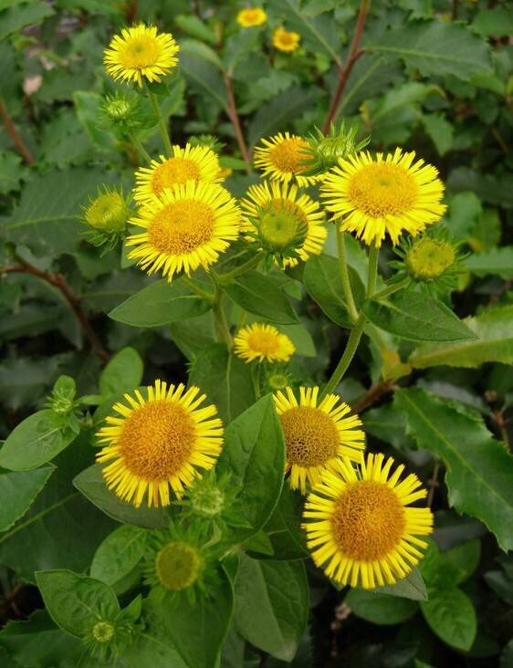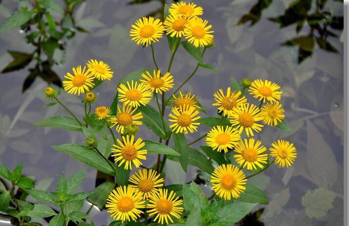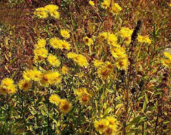 旋复花(拉丁学名:Inula japonica Thunb.),又名:金佛草、六月菊。多年生草本,高30-70厘米。头状花序少数或多数,顶生,呈伞房状排列。瘦果长椭圆形,被白色硬毛,冠毛白色。花期6-10月,果期9-11月。生于山坡、路旁、田边或水旁湿地。分布东北、华北、西北及华东等地。根及叶治刀伤、疔毒,煎服可平喘镇咳;花是健胃祛痰药,也治胸中丕闷、胃部膨胀、暖气、咳嗽、呕逆等。