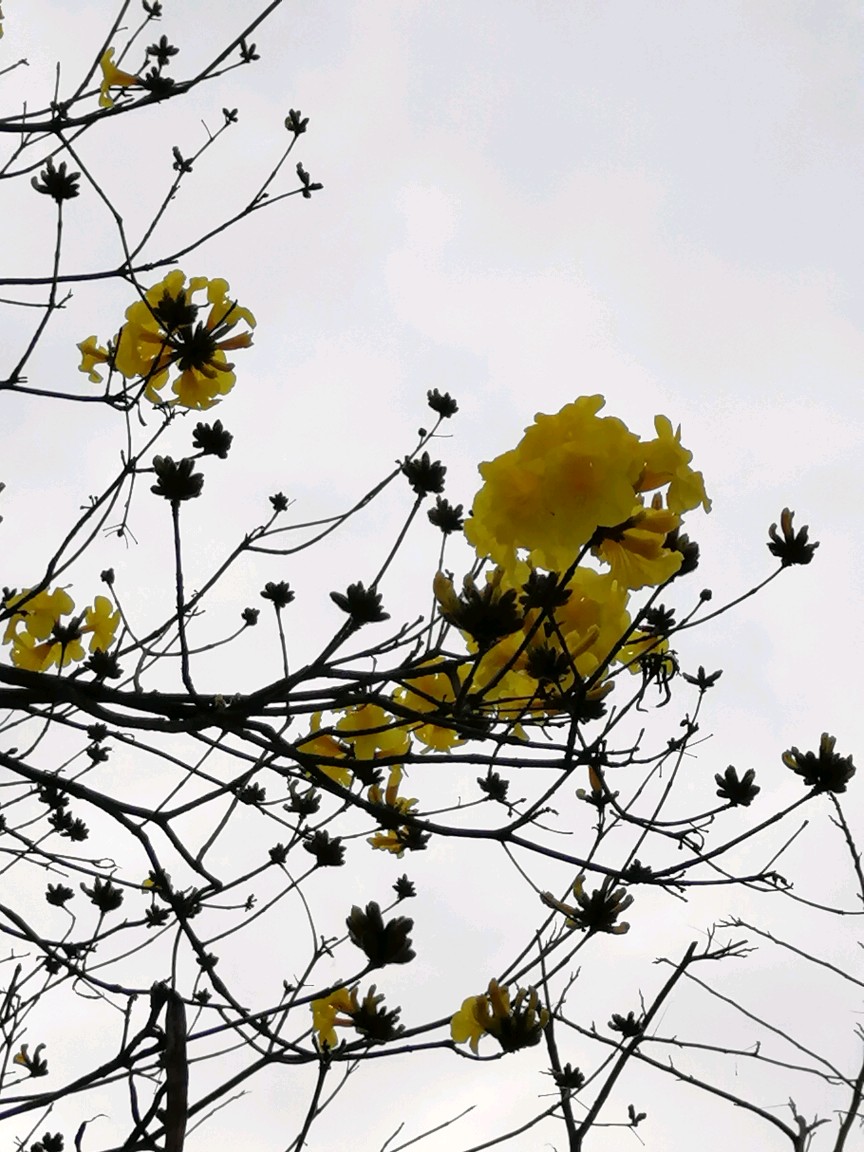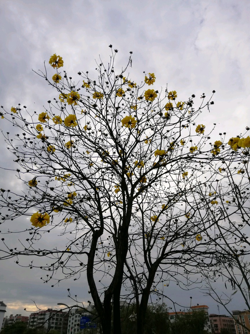 昨天下午去剑英公园散步,远远的望见几棵光秃秃的树枝上摇曳着黄色的花儿,被风一吹,左右摇摆着,甚有风情。
