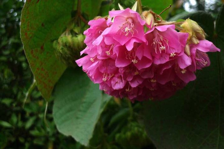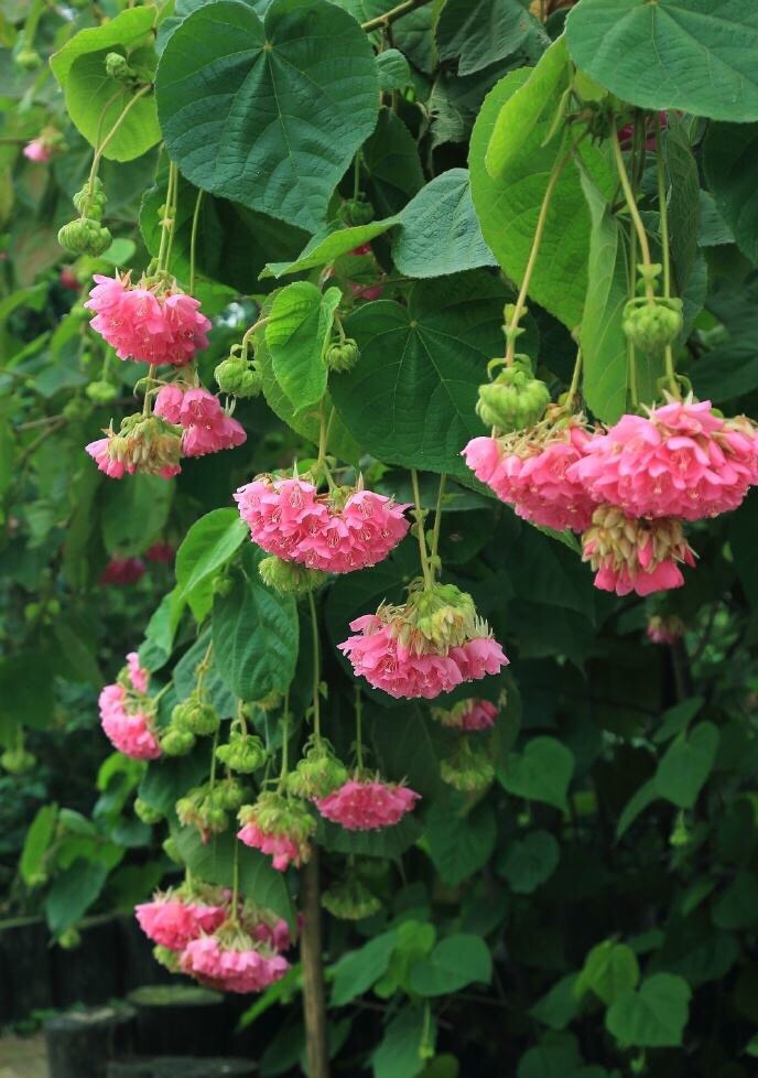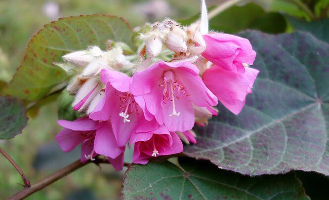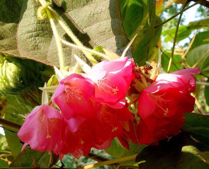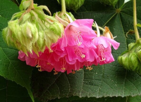 非洲芙蓉 (学名:Dombeya acutangula Cav.)是梧桐科,非洲芙蓉属常绿中型灌木或小乔木,高可达15米。树冠圆形,枝叶密集。树枝棕色,叶面质感粗糙,叶片互生,心形,叶缘顿锯齿,掌状脉,花从叶腋间伸出,伞形花序,冬季开花,12月至翌年3月开花。