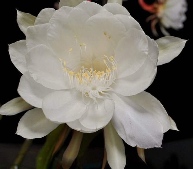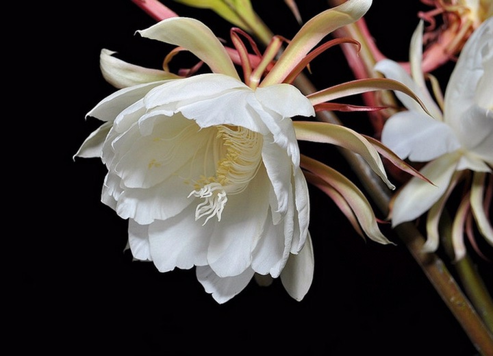 昙花是附生肉质灌木植物,高2-6米,老茎圆柱状,木质化。分枝多数,叶状侧扁,披针形至长圆状披针形,长15-100厘米,宽5-12厘米,先端长渐尖至急尖,或圆形,边缘波状或具深圆齿,基部急尖、短渐尖或渐狭成柄状,深绿色,无毛,中肋粗大,宽2-6毫米,于两面突起,老株分枝产生气根;小窠排列于齿间凹陷处,小形,无刺,初具少数绵毛,后裸露。花单生于枝侧的小窠,漏斗状,于夜间开放,芳香,长25-30厘米,直径10-12厘米;花托绿色,略具角,被三角形短鳞片;花托筒长13-18厘米,基部直径4-9毫米,多少弯曲,疏生长3-10毫米的披针形鳞片,鳞腋小窠通常无毛;萼状花被片绿白色、淡琥珀色色或带红晕,线形至倒披针形,长8-10厘米,宽3-4毫米,先端渐尖,边缘全缘,通常反曲;瓣状花被片白色,倒卵状披针形至倒卵形,长7-10厘米,宽3-4.5厘米,先端急尖至圆形,有时具芒尖,边缘全缘或啮蚀状;雄蕊多数,排成两列;花丝白色,长2.5-5厘米;花药淡黄色,长3-3.5毫米;花柱白色,长20-22厘米,直径3-4毫米;柱头15-20,狭线形,长16-18毫米,先端长渐尖,开展,黄白色。浆果长球形,具纵棱脊,无毛,紫红色。种子多数,卵状肾形,亮黑色,具皱纹,无毛。